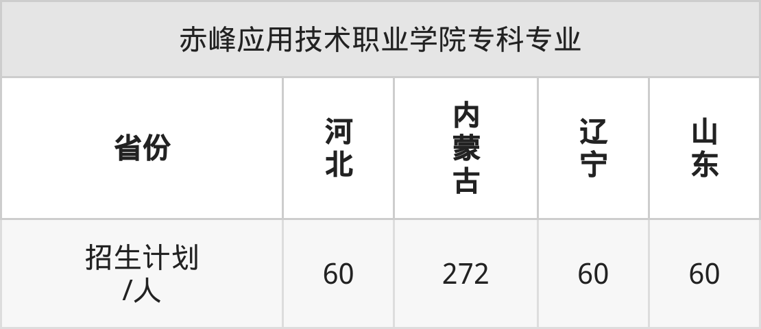 赤峰应用技术职业学院面向辽宁(60人)、山东(60人)、河北(60人)、内蒙古(272人)开展专科招生。其中山东招生批次为二段,其余省份为专科批。