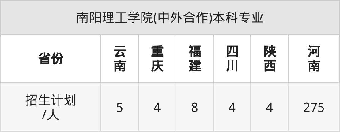南阳理工学院(中外合作)面向重庆(4人)、福建(8人)、四川(4人)、陕西(4人)、河南(275人)、云南(5人)开展本科招生。其中云南招生批次为二本,重庆、福建招生批次为本科批,其余省份为本科二批。