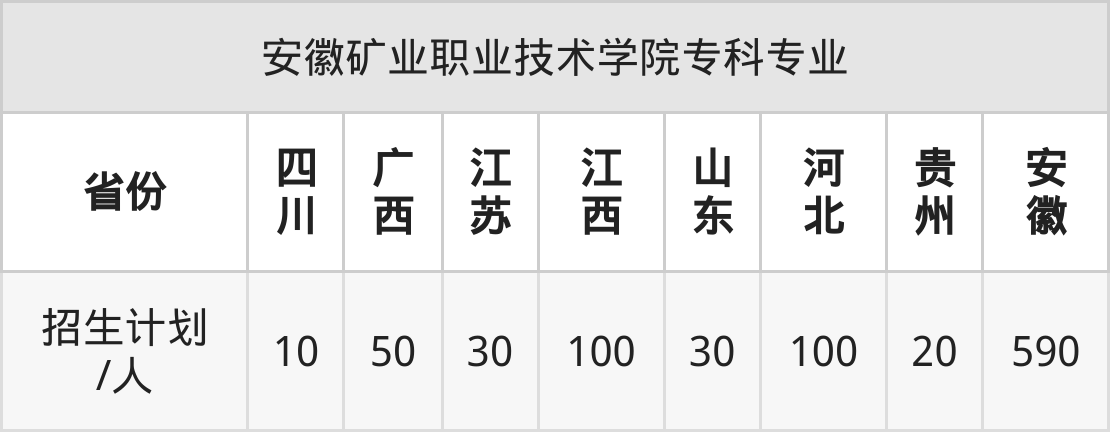 安徽矿业职业技术学院面向安徽(590人)、四川(10人)、广西(50人)、江苏(30人)、江西(100人)、山东(30人)、河北(100人)等8个地区开展专科招生。其中山东招生批次为二段,其余省份为专科批。