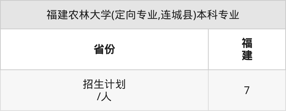 福建农林大学(定向专业,连城县)面向福建(7人)开展本科招生。招生批次为本科批。