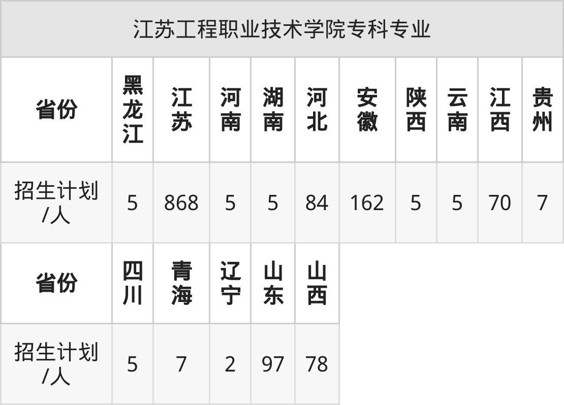 江苏工程职业技术学院面向黑龙江(5人)、陕西(5人)、云南(5人)、贵州(7人)、四川(5人)、辽宁(2人)、山东(97人)等15个地区开展专科招生。其中山东招生批次为二段,其余省份为专科批。