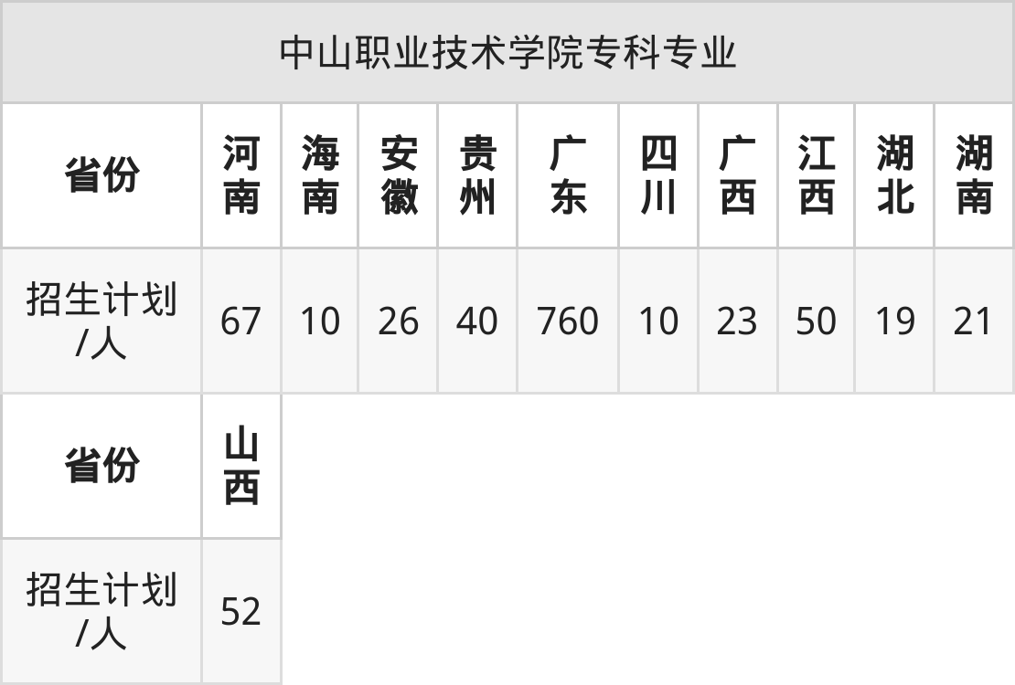 中山职业技术学院面向海南(10人)、安徽(26人)、广西(23人)、河南(67人)、湖南(21人)、江西(50人)、湖北(19人)等11个地区开展专科招生。招生批次为专科批。