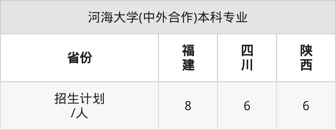 河海大学(中外合作)面向陕西(6人)、福建(8人)、四川(6人)开展本科招生。其中福建招生批次为本科批,其余省份为本科一批。