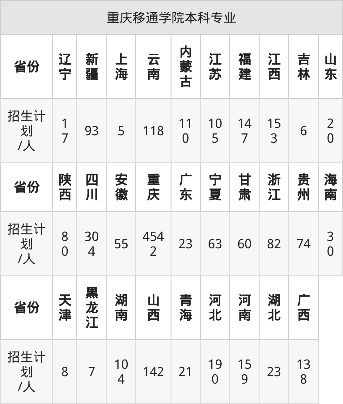 重庆移通学院面向黑龙江(7人)、陕西(80人)、上海(5人)、江西(153人)、海南(30人)、云南(118人)、湖南(104人)等29个地区开展本科招生。其中四川、内蒙古、新疆、陕西、河南招生批次为本科二批,其余省份为本科批。