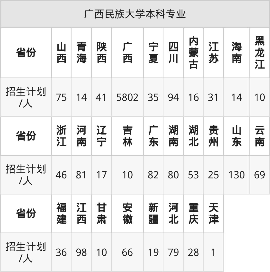 广西民族大学面向江西(98人)、山东(130人)、海南(14人)、福建(36人)、辽宁(17人)、湖北(53人)、湖南(80人)等28个地区开展本科招生。其中青海招生批次为本科一段,新疆、陕西、内蒙古、河南、四川招生批次为本科二批,其余省份为本科批。