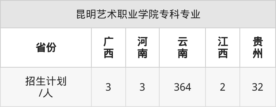 昆明艺术职业学院面向广西(3人)、河南(3人)、云南(364人)、江西(2人)、贵州(32人)开展专科招生。招生批次为专科批。