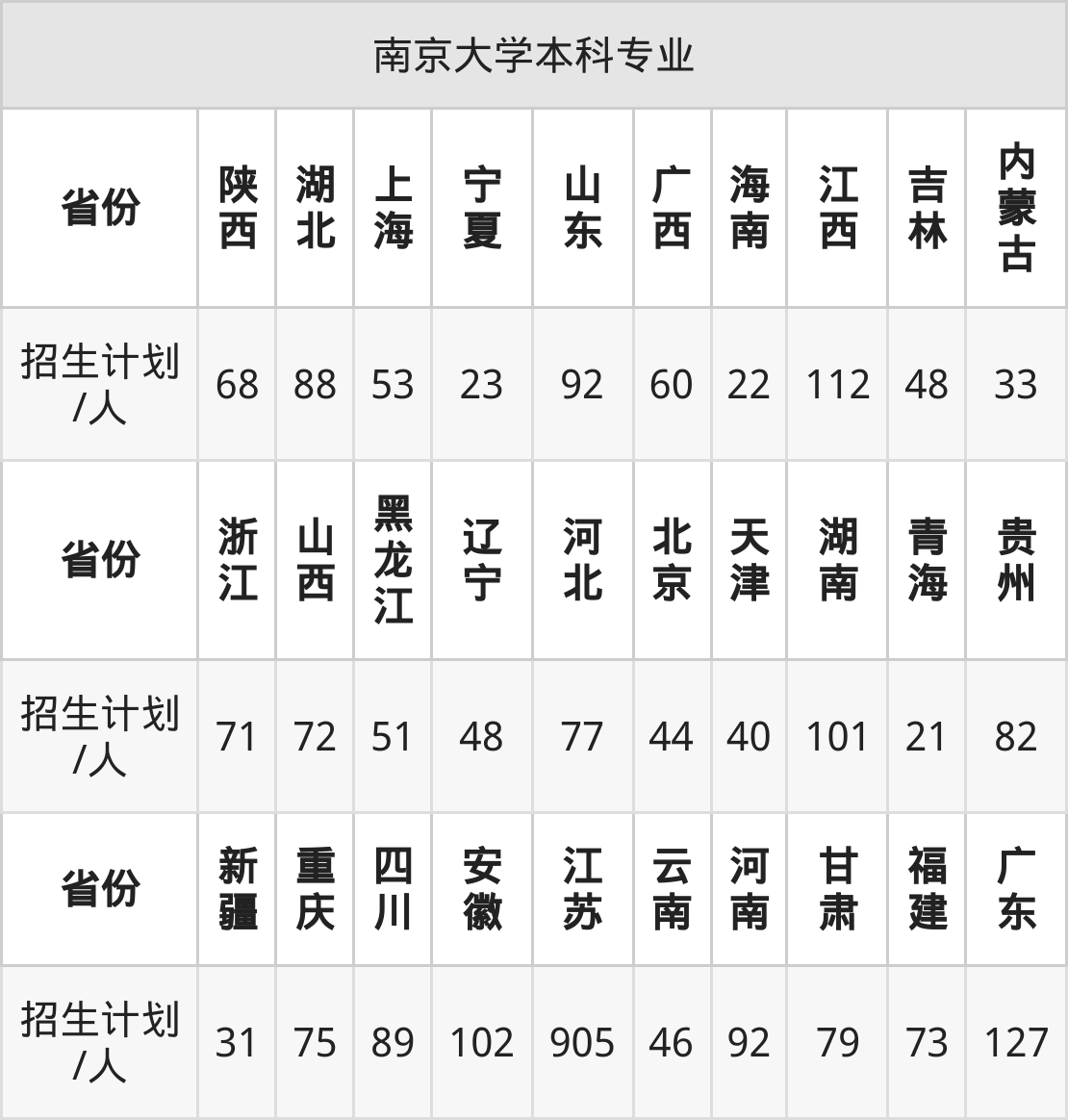 南京大学面向新疆(31人)、宁夏(23人)、辽宁(48人)、河北(77人)、贵州(82人)、湖北(88人)、吉林(48人)等30个地区开展本科招生。其中云南招生批次为一本,四川、陕西、河南、内蒙古、新疆招生批次为本科一批,其余省份为本科批。