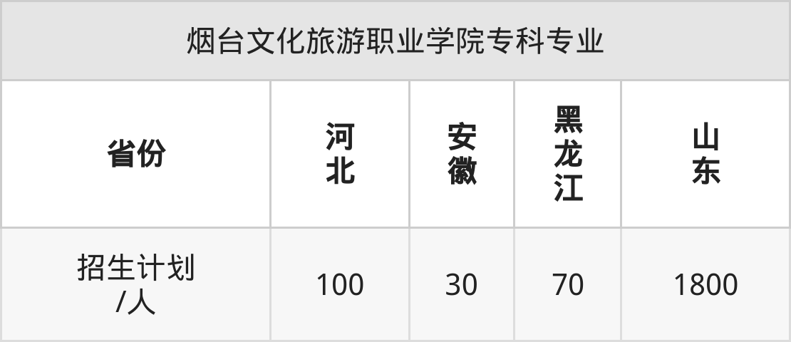 烟台文化旅游职业学院面向河北(100人)、安徽(30人)、黑龙江(70人)、山东(1800人)开展专科招生。其中山东招生批次为二段,其余省份为专科批。