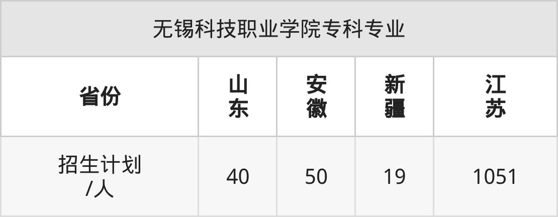 无锡科技职业学院面向山东(40人)、安徽(50人)、新疆(19人)、江苏(1051人)开展专科招生。其中山东招生批次为二段,其余省份为专科批。