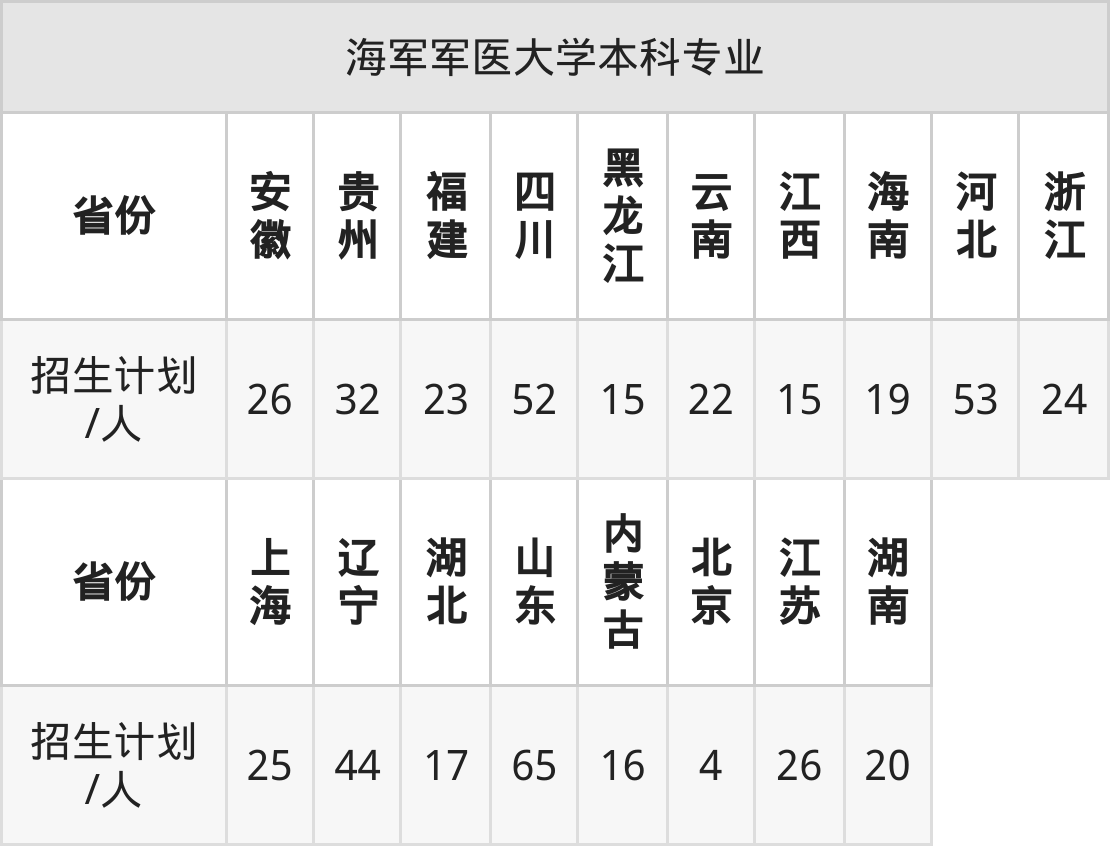 海军军医大学面向浙江(24人)、安徽(26人)、内蒙古(16人)、北京(4人)、江苏(26人)、湖南(20人)、山东(65人)等18个地区开展本科招生。其中云南招生批次为一本,黑龙江、湖北、江西招生批次为本科提前批,其余省份为本科批。