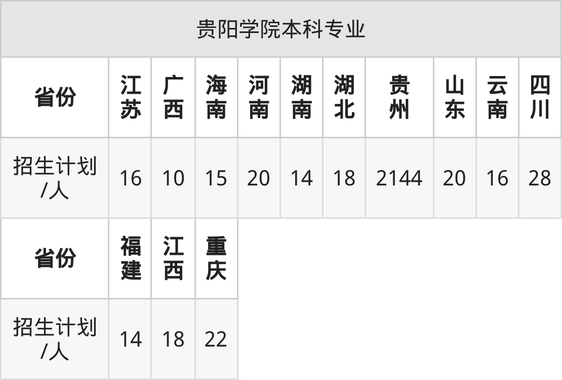 贵阳学院面向贵州(2144人)、江苏(16人)、云南(16人)、湖北(18人)、湖南(14人)、重庆(22人)、海南(15人)等13个地区开展本科招生。其中云南招生批次为二本,四川、河南招生批次为本科二批,其余省份为本科批。