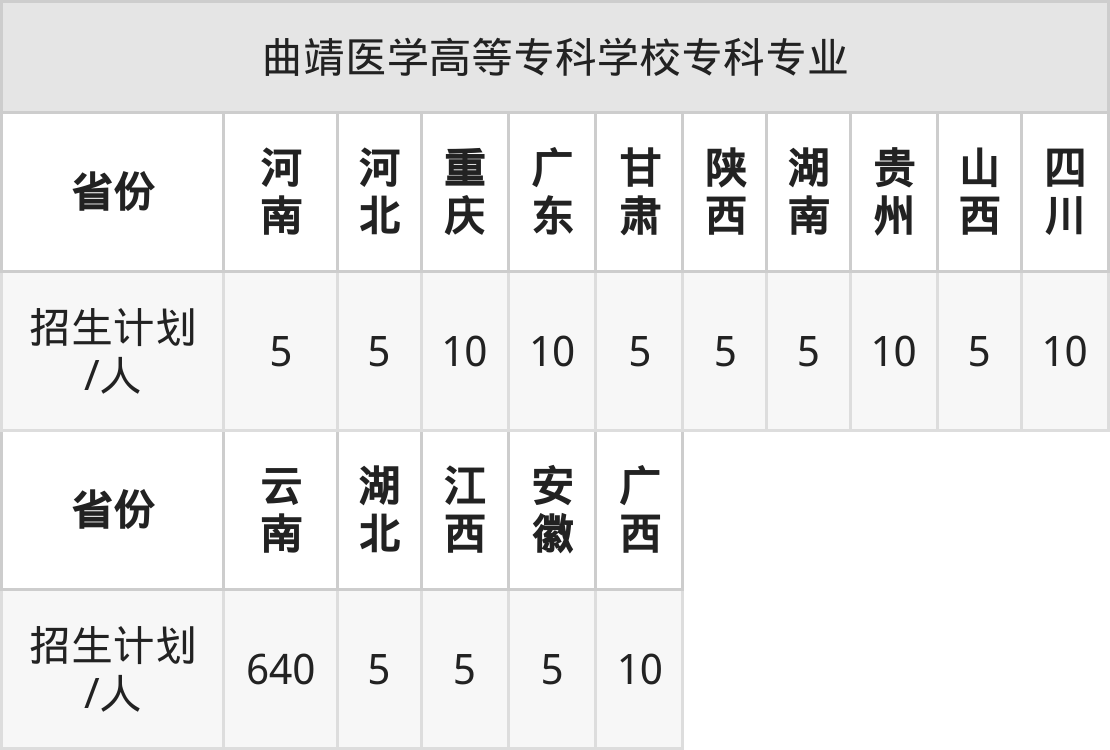 曲靖医学高等专科学校面向重庆(10人)、陕西(5人)、山西(5人)、四川(10人)、广东(10人)、湖北(5人)、河南(5人)等15个地区开展专科招生。招生批次为专科批。