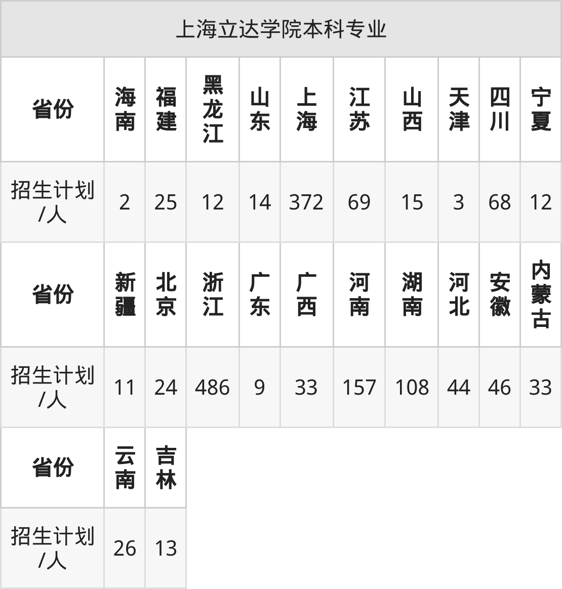 上海立达学院面向新疆(11人)、云南(26人)、福建(25人)、安徽(46人)、宁夏(12人)、北京(24人)、吉林(13人)等22个地区开展本科招生。其中山东招生批次为一段,河南、内蒙古、四川、新疆招生批次为本科二批,其余省份为本科批。