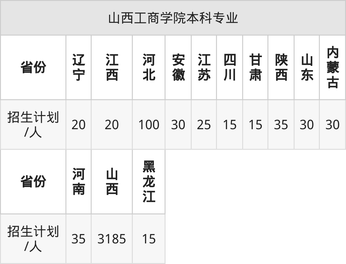 山西工商学院面向辽宁(20人)、山西(3185人)、河北(100人)、四川(15人)、甘肃(15人)、内蒙古(30人)、江苏(25人)等13个地区开展本科招生。其中山西招生批次为第二批本科C类,陕西、内蒙古、河南、四川招生批次为本科二批,其余省份为本科批。