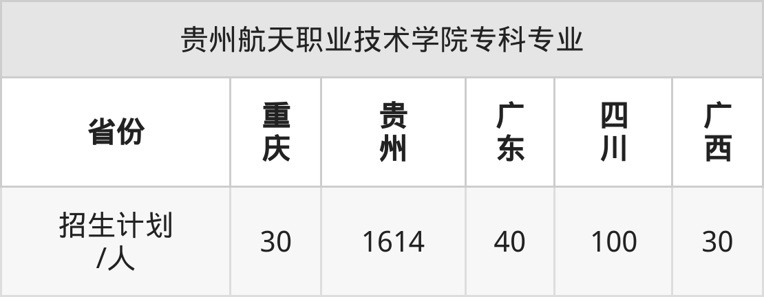 贵州航天职业技术学院面向重庆(30人)、贵州(1614人)、广东(40人)、四川(100人)、广西(30人)开展专科招生。招生批次为专科批。