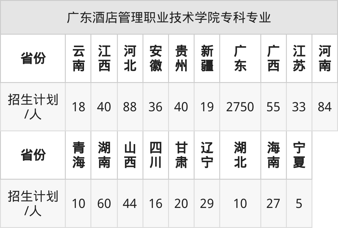 广东酒店管理职业技术学院面向云南(18人)、江西(40人)、湖北(10人)、河南(84人)、辽宁(29人)、贵州(40人)、广西(55人)等19个地区开展专科招生。招生批次为专科批。