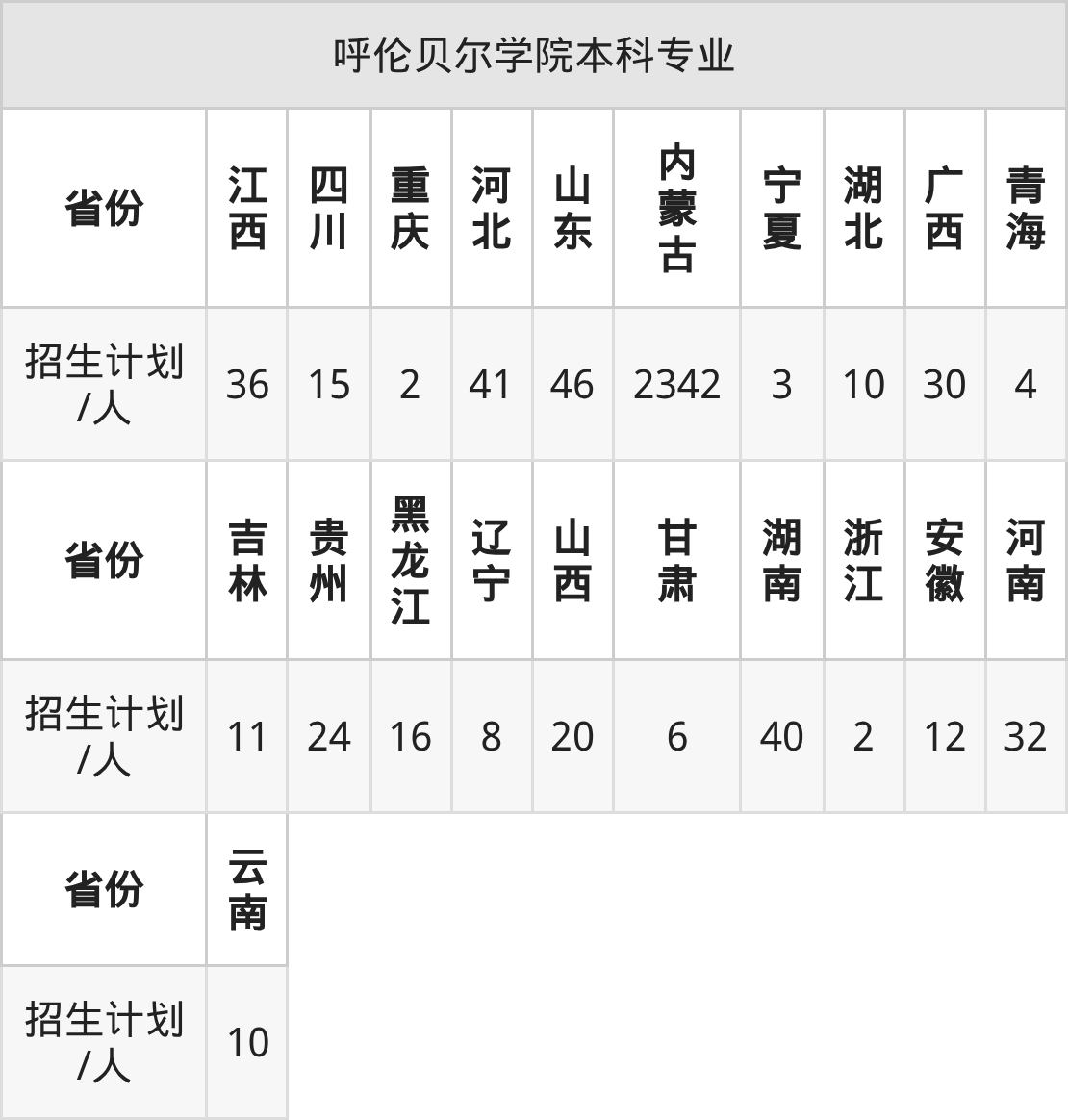 呼伦贝尔学院面向吉林(11人)、湖北(10人)、甘肃(6人)、广西(30人)、青海(4人)、河北(41人)、浙江(2人)等21个地区开展本科招生。其中甘肃招生批次为本科批C段,云南、宁夏、四川招生批次为本科批B段,其余省份为本科批。