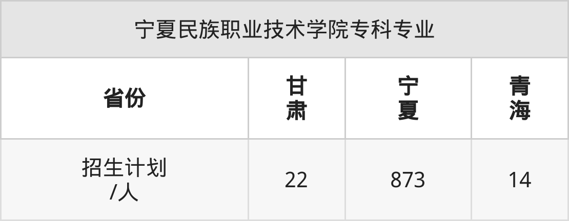 宁夏民族职业技术学院面向甘肃(22人)、宁夏(873人)、青海(14人)开展专科招生。招生批次为专科批。