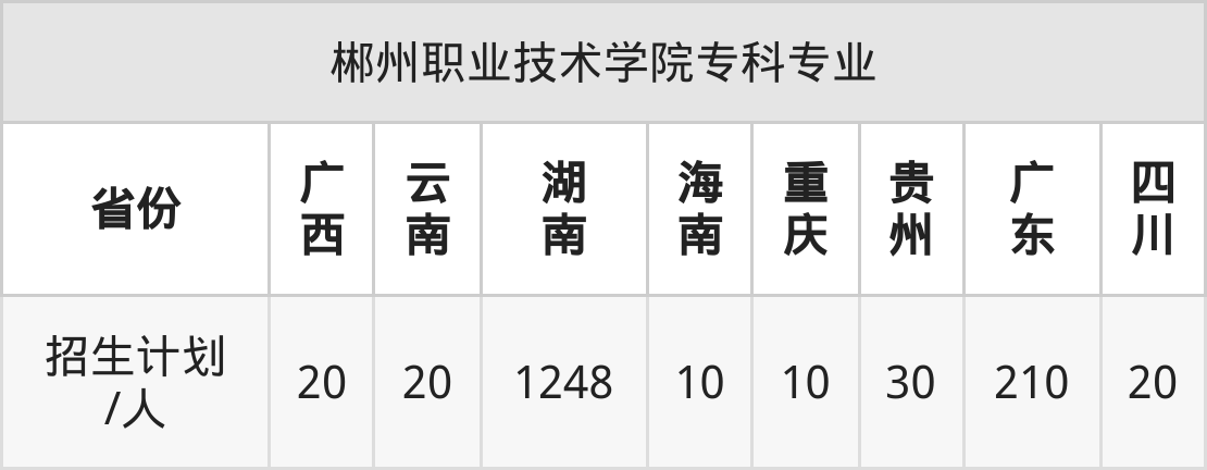 郴州职业技术学院面向广东(210人)、四川(20人)、广西(20人)、云南(20人)、湖南(1248人)、海南(10人)、重庆(10人)等8个地区开展专科招生。招生批次为专科批。
