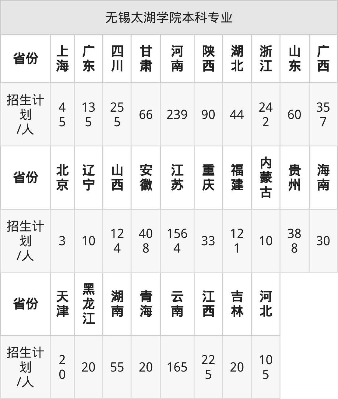 无锡太湖学院面向河北(105人)、天津(20人)、安徽(408人)、海南(30人)、云南(165人)、江西(225人)、辽宁(10人)等28个地区开展本科招生。其中云南招生批次为二本,四川、陕西、内蒙古、河南招生批次为本科二批,其余省份为本科批。