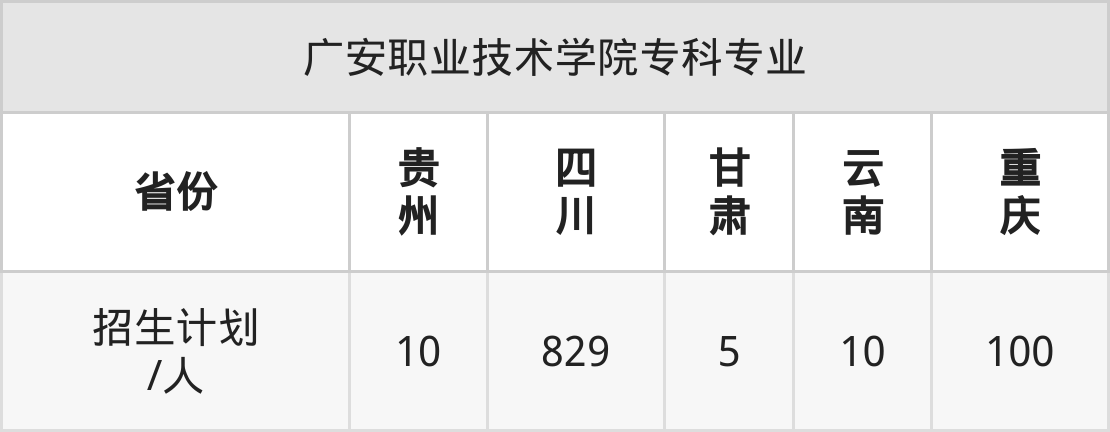 广安职业技术学院面向四川(829人)、甘肃(5人)、云南(10人)、重庆(100人)、贵州(10人)开展专科招生。招生批次为专科批。