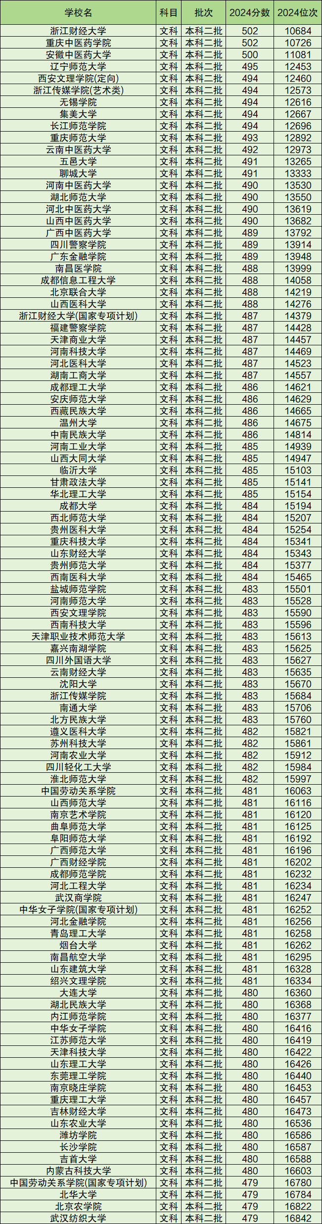 2024年在文科方面,一本院校的录取线488分-645分之间,位次在14303名-21名之间;二本院校的录取线在697分-502分之间,位次在47894名-10684名之间。