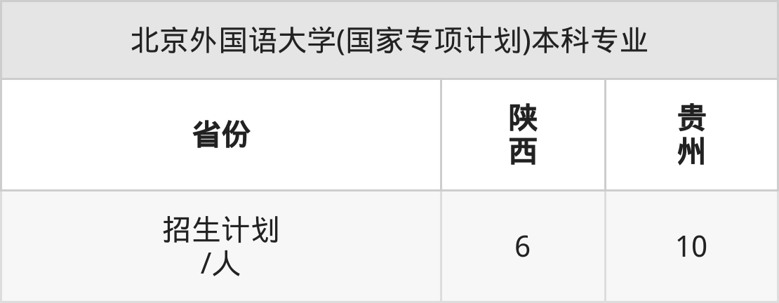 北京外国语大学(国家专项计划)面向贵州(10人)、陕西(6人)开展本科招生。招生批次为本科批。