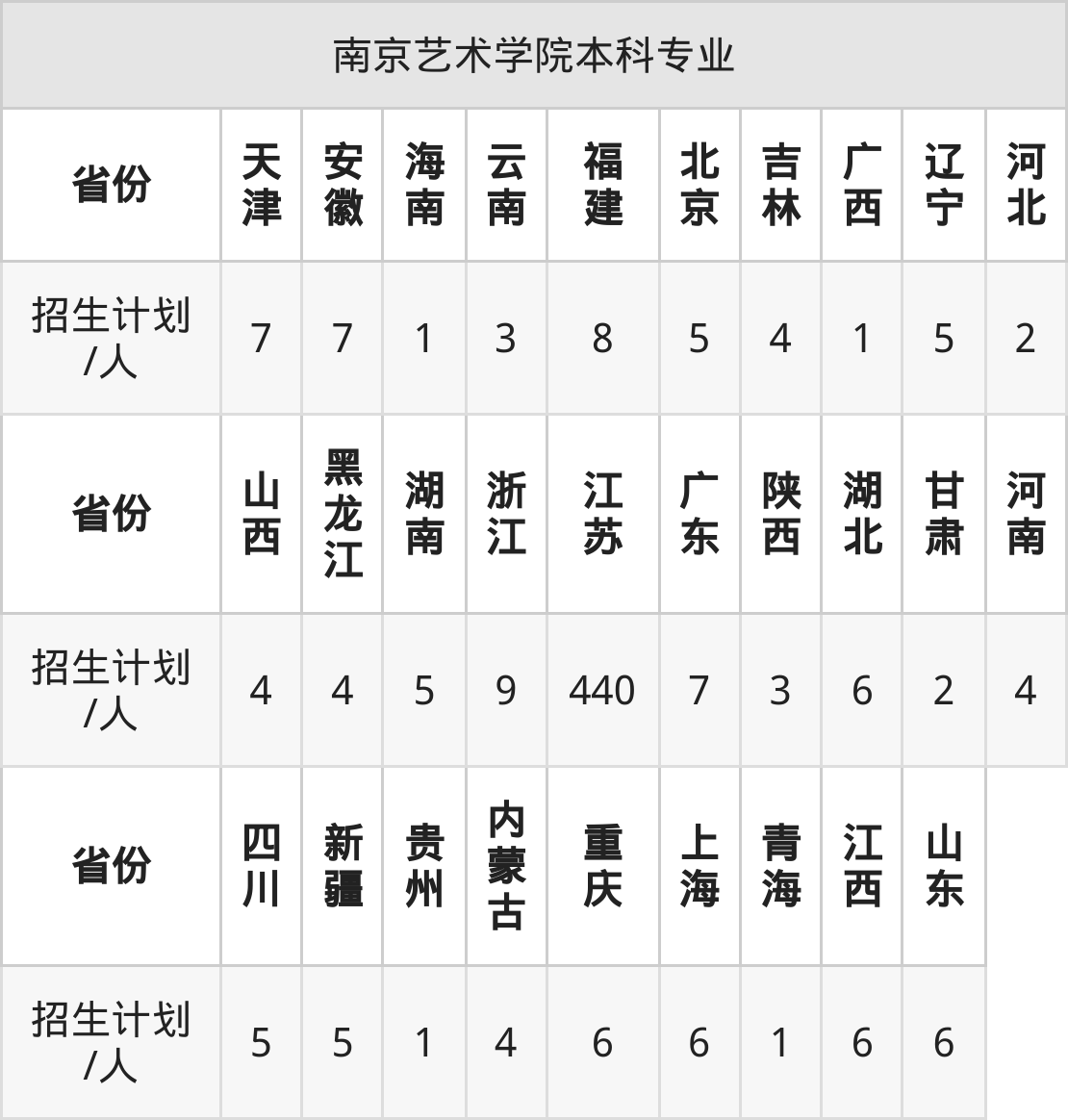 南京艺术学院面向海南(1人)、河北(2人)、浙江(9人)、吉林(4人)、重庆(6人)、福建(8人)、广东(7人)等29个地区开展本科招生。其中陕西、四川、新疆、河南、内蒙古招生批次为本科二批,其余省份为本科批。