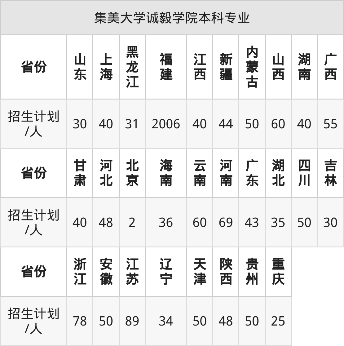 集美大学诚毅学院面向天津(50人)、广东(43人)、上海(40人)、吉林(30人)、江西(40人)、四川(50人)、内蒙古(50人)等28个地区开展本科招生。其中山西招生批次为第二批本科C类,新疆、内蒙古、四川、陕西、河南招生批次为本科二批,其余省份为本科批。