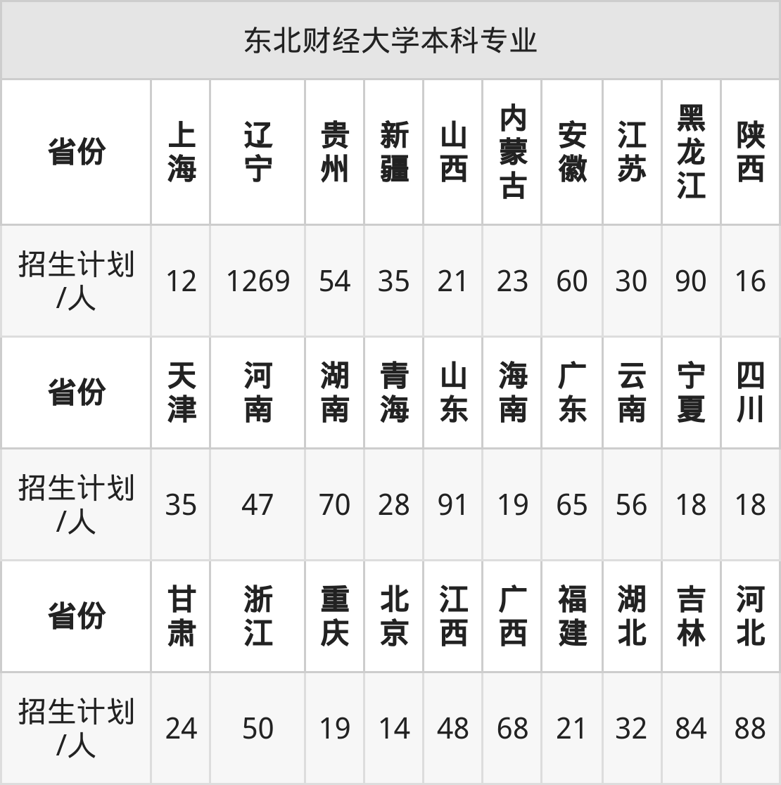 东北财经大学面向安徽(60人)、陕西(16人)、黑龙江(90人)、北京(14人)、江苏(30人)、湖北(32人)、福建(21人)等30个地区开展本科招生。其中云南招生批次为一本,新疆、内蒙古、河南、四川、陕西招生批次为本科一批,其余省份为本科批。