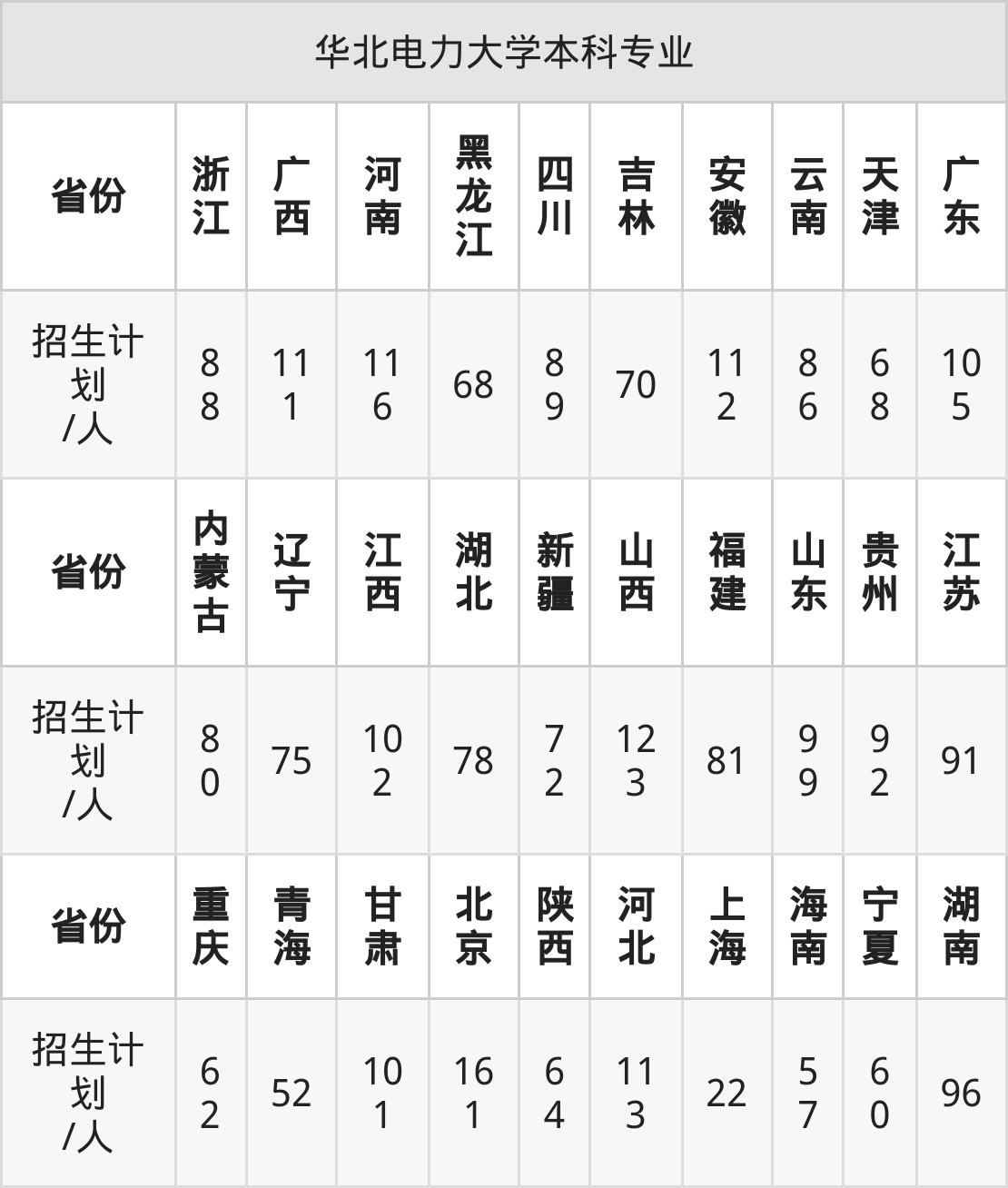 华北电力大学面向甘肃(101人)、黑龙江(68人)、山东(99人)、宁夏(60人)、广西(111人)、四川(89人)、内蒙古(80人)等30个地区开展本科招生。其中宁夏招生批次为第一批本科,陕西、内蒙古、四川、河南、新疆招生批次为本科一批,其余省份为本科批。