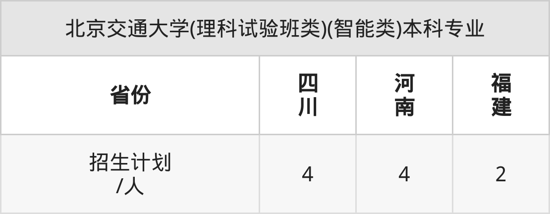 北京交通大学(理科试验班类)(智能类)面向四川(4人)、河南(4人)、福建(2人)开展本科招生。其中福建招生批次为本科批,其余省份为本科一批。