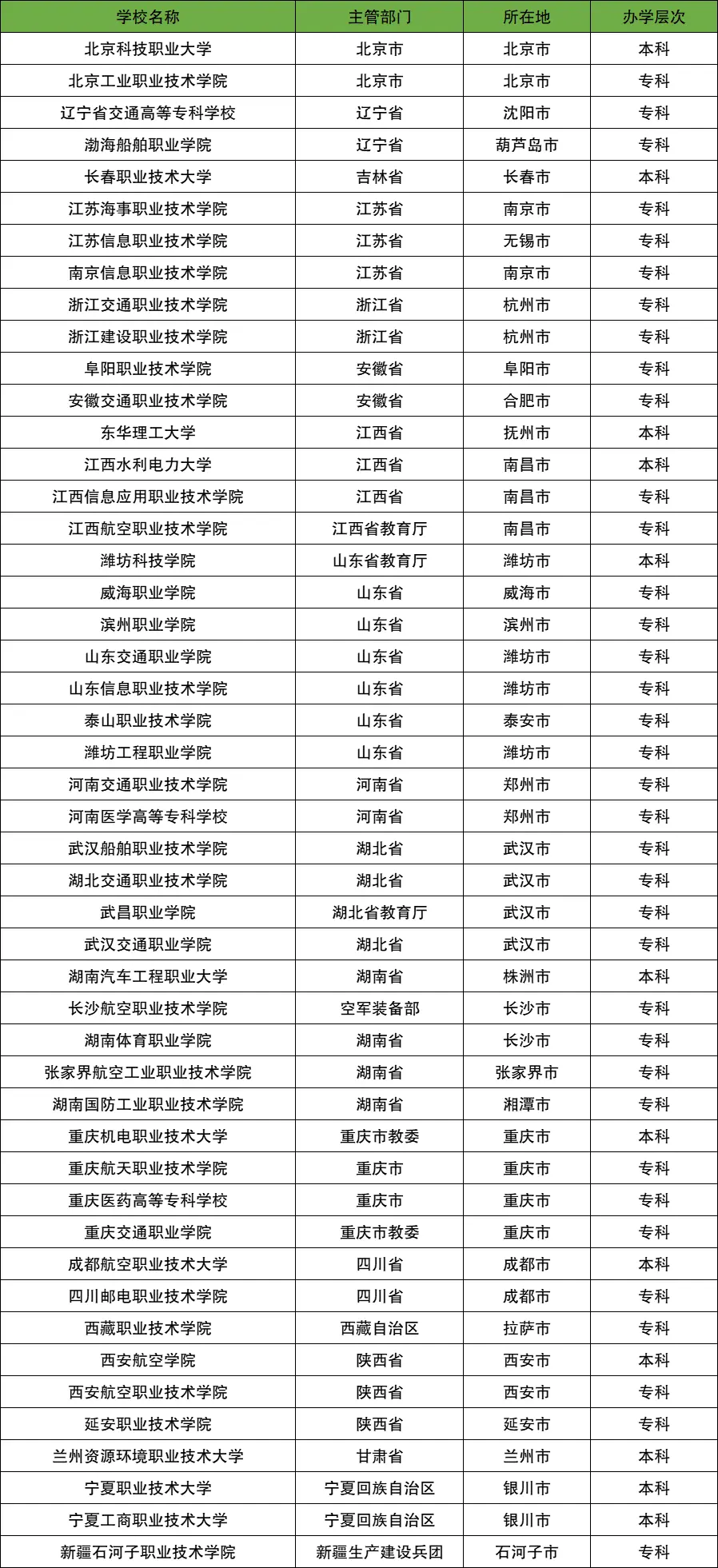 湖南省:湖南国防工业职业技术学院、湖南汽车工程职业大学、湖南体育职业学院、张家界航空工业职业技术学院