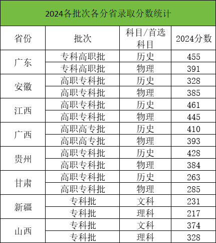 2024年广州番禺职业技术学院专科批招生,各省最低录取分数线如下: