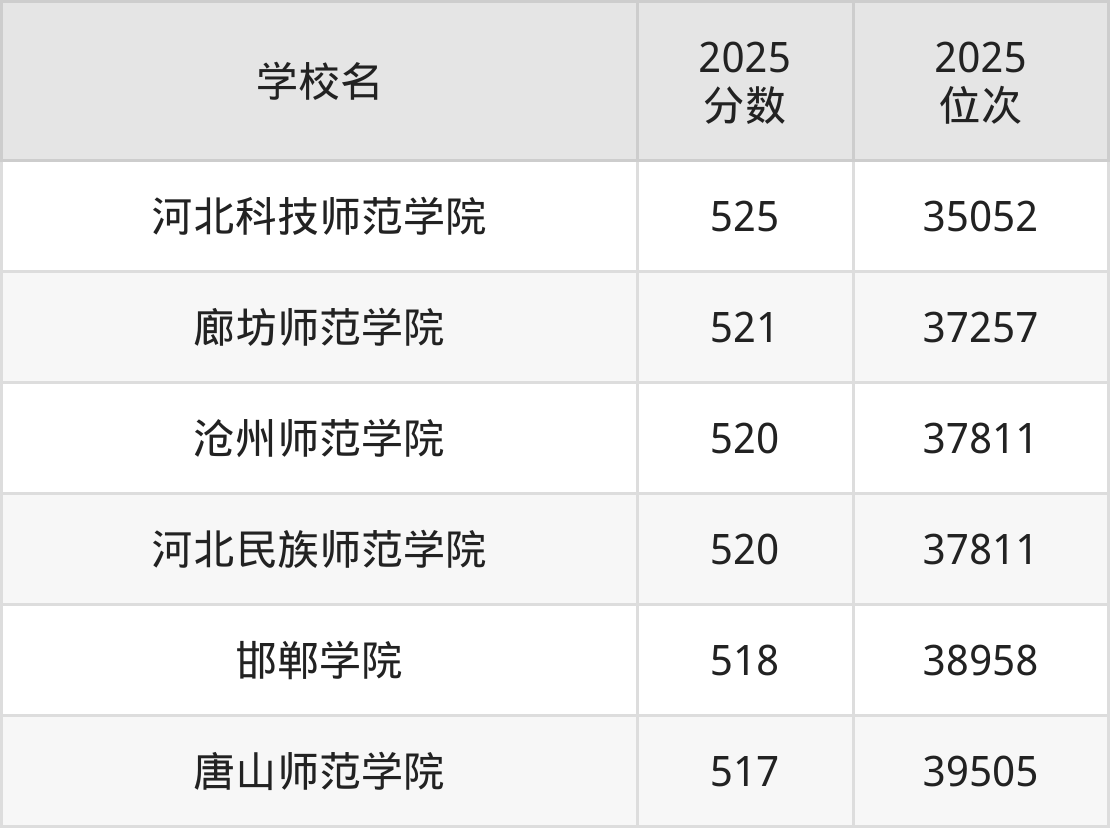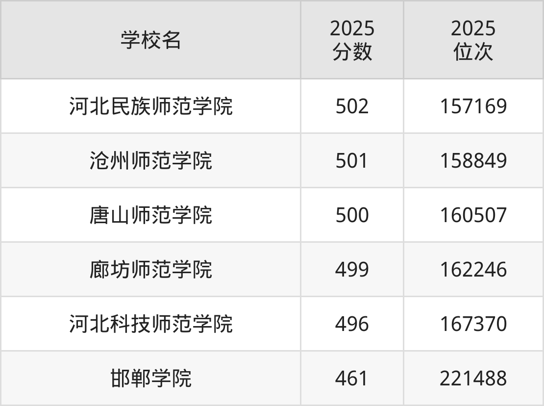 按照2025年河北省所有二本师范院校在省内录取分数线高低排名,为大家整理出了河北所有二本师范院校名单如下。