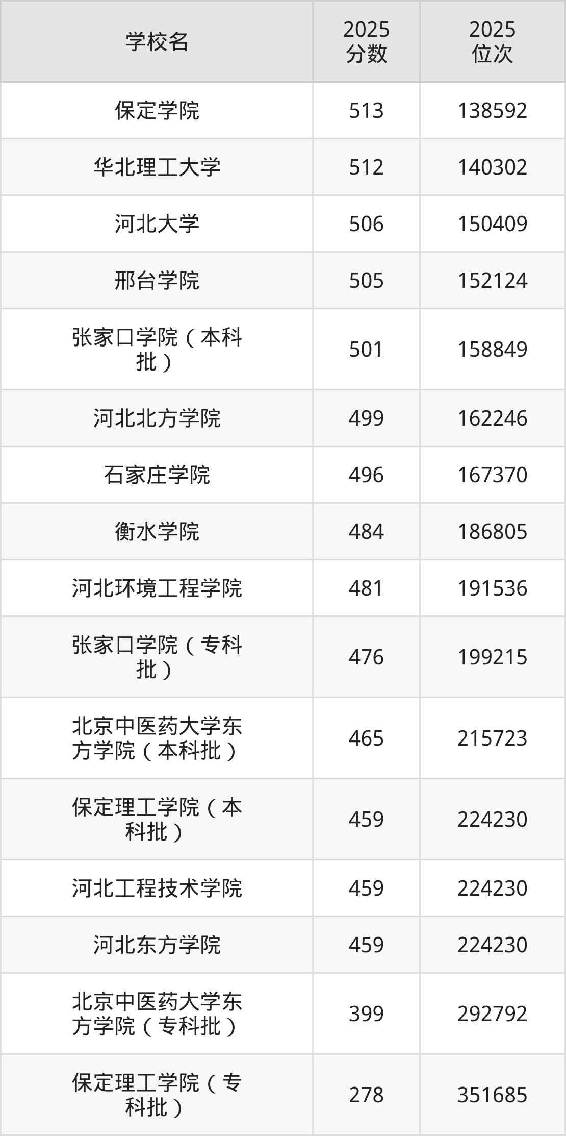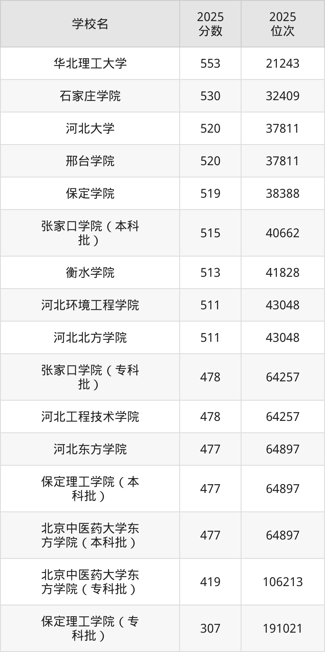 河北省所有综合类院校2025年录取分数线一览表(前16院校):