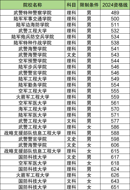 武警工程大学(586分)、武警海警学院(606分)、战略支援部队信息工程大学(615分)、空军军医大学(618分)等。