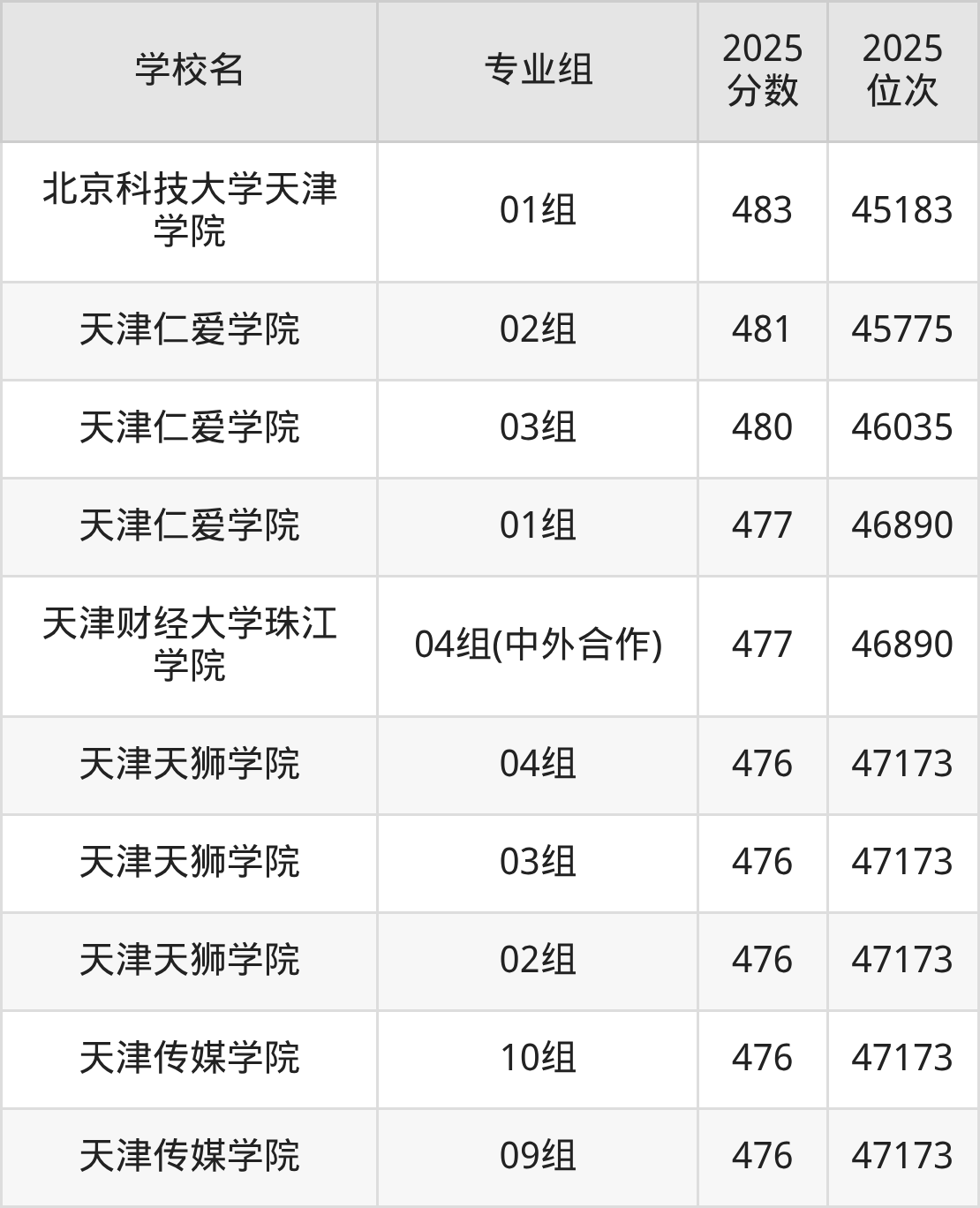 最好考、收分最低的是:天津天狮学院,2025年04组最低分476分,最低排名47173名。