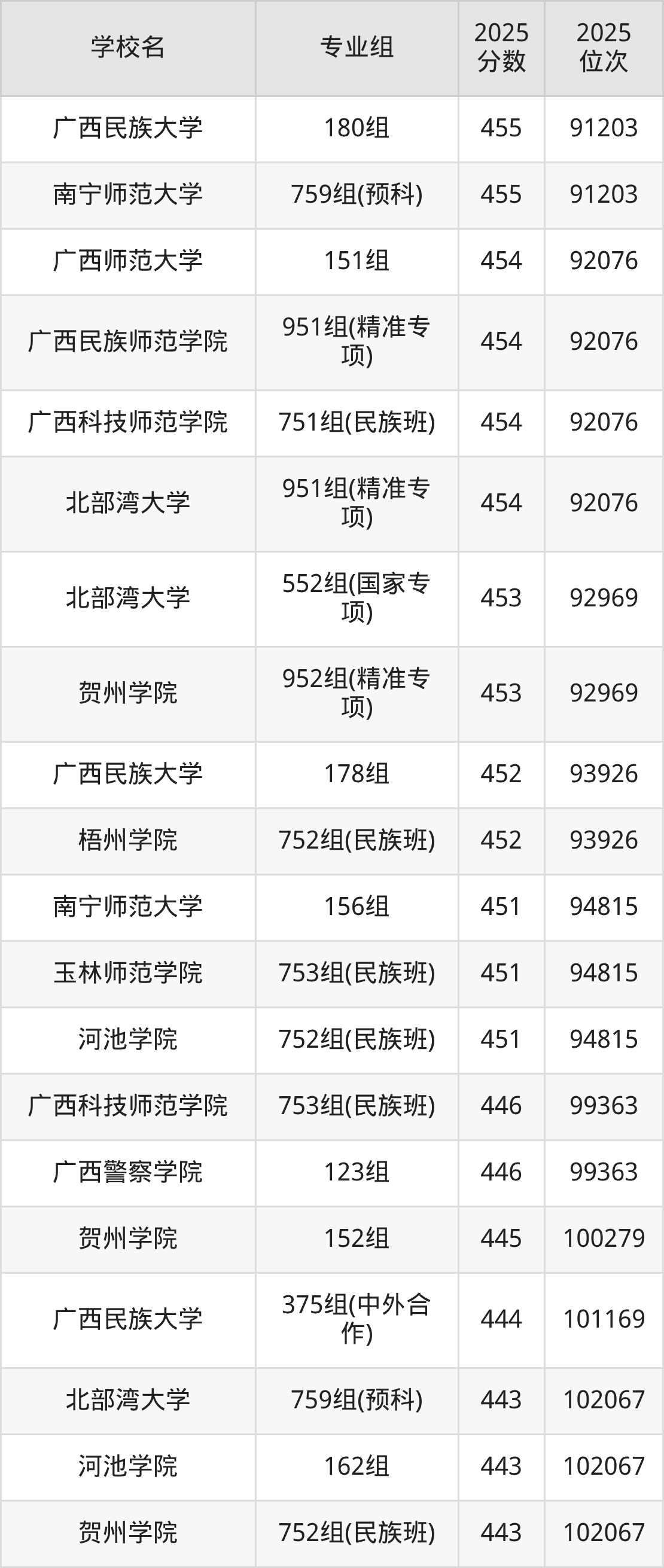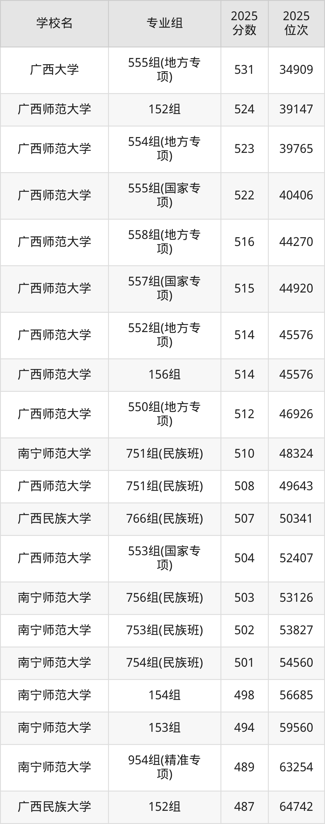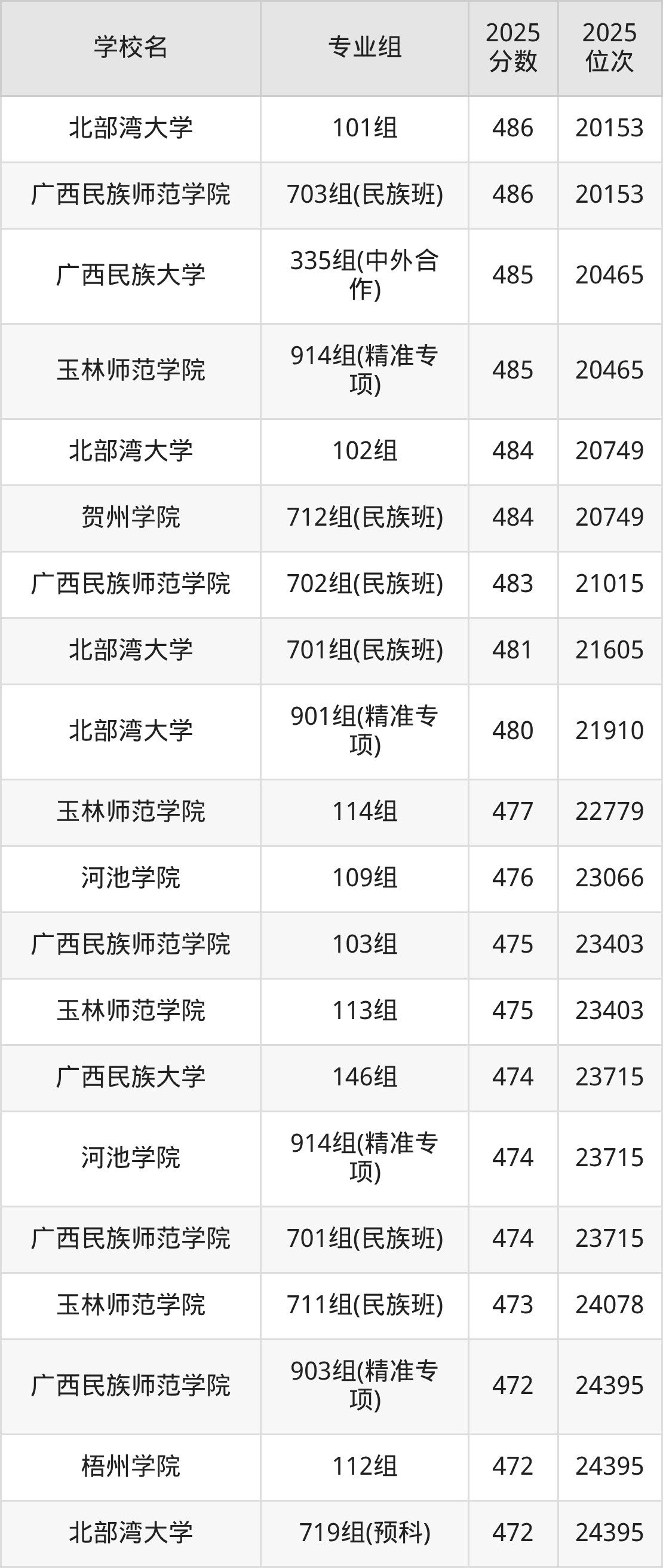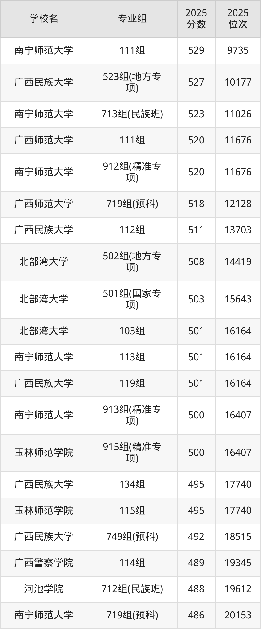 广西壮族自治区所有文科院校2025年录取分数线一览表: