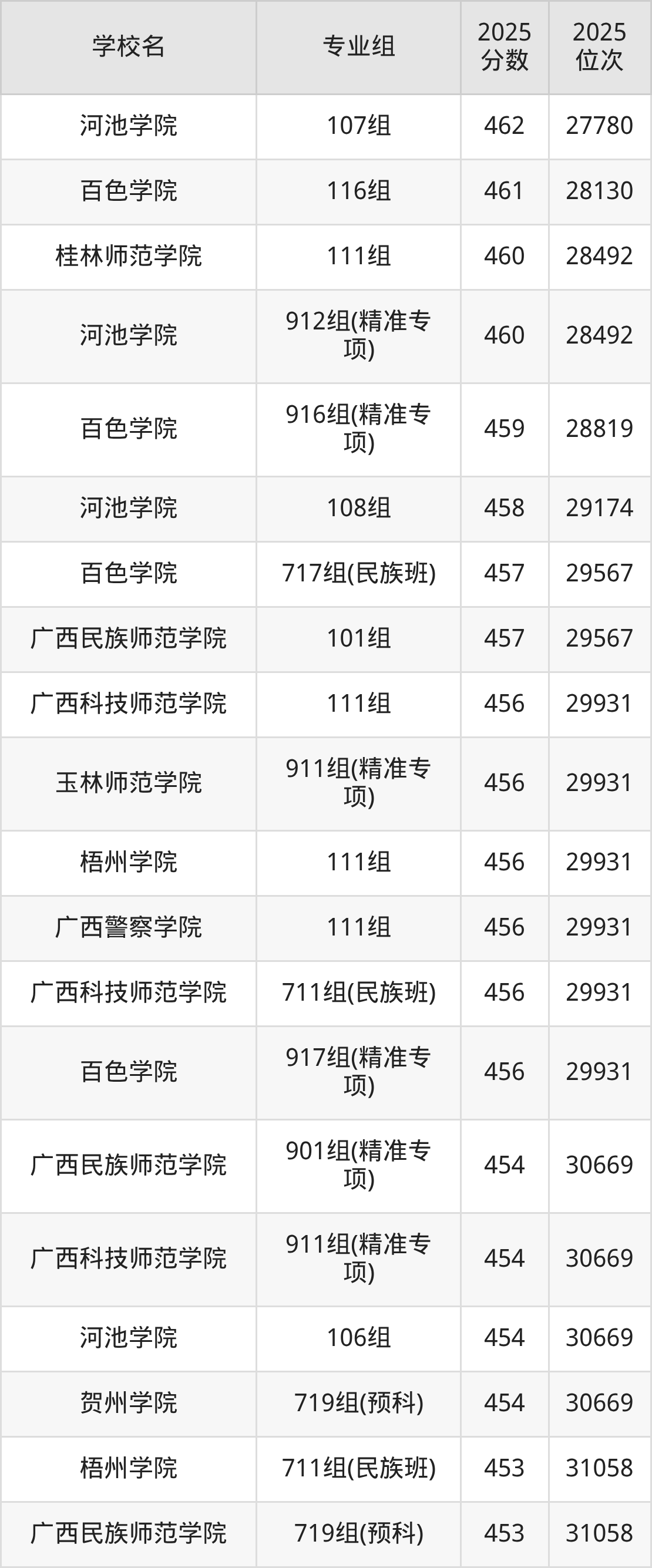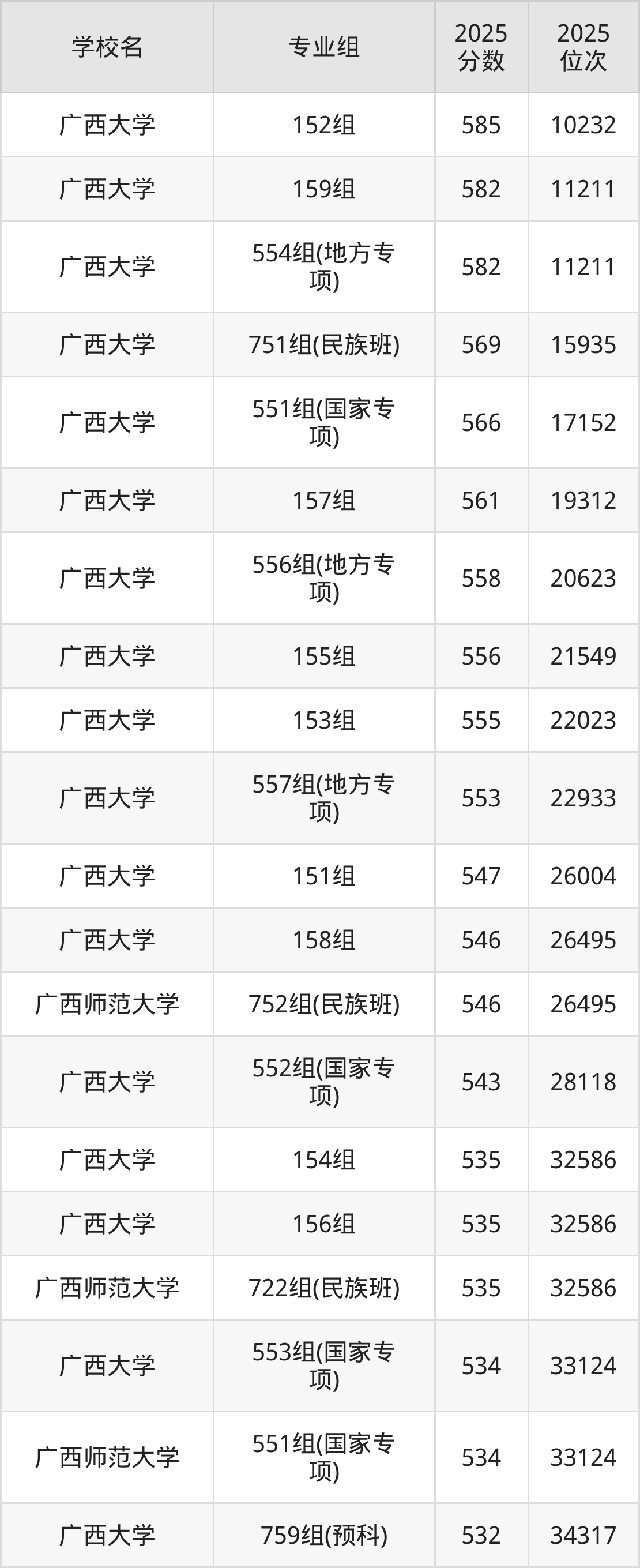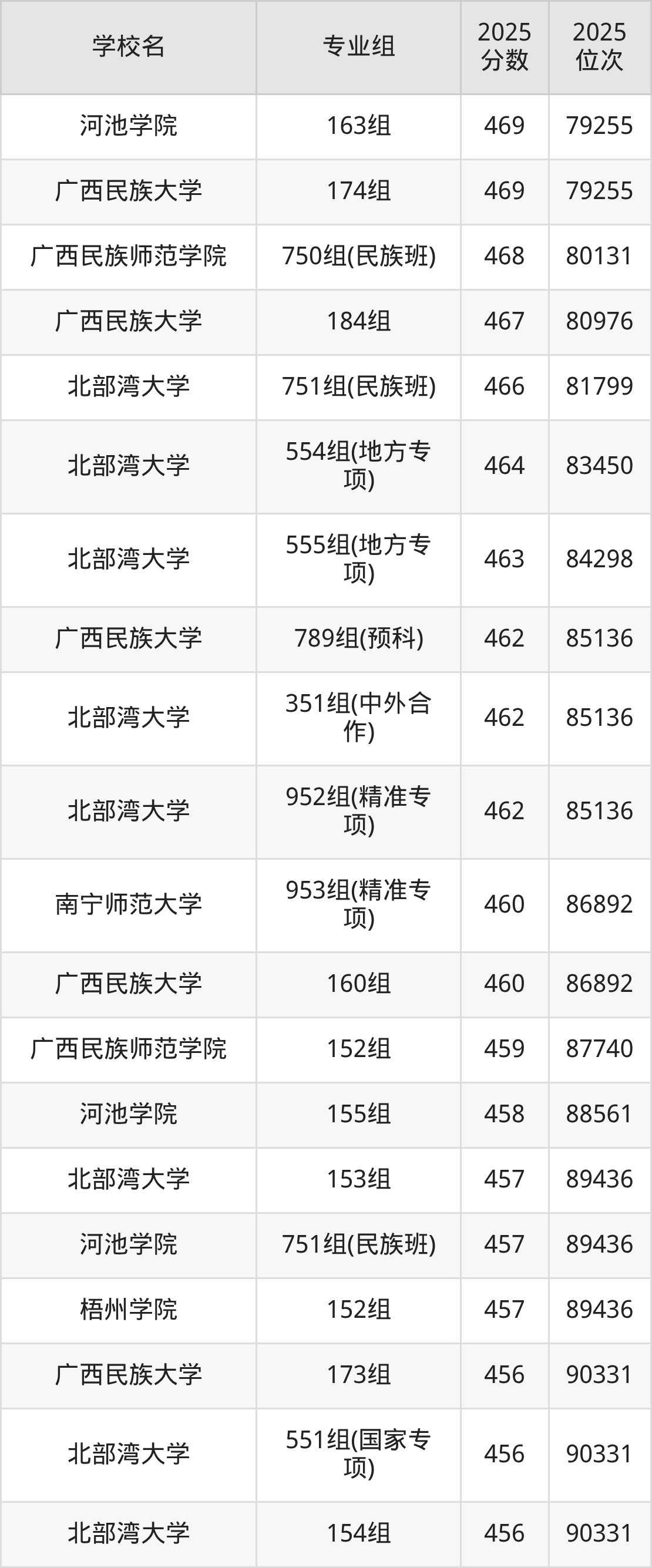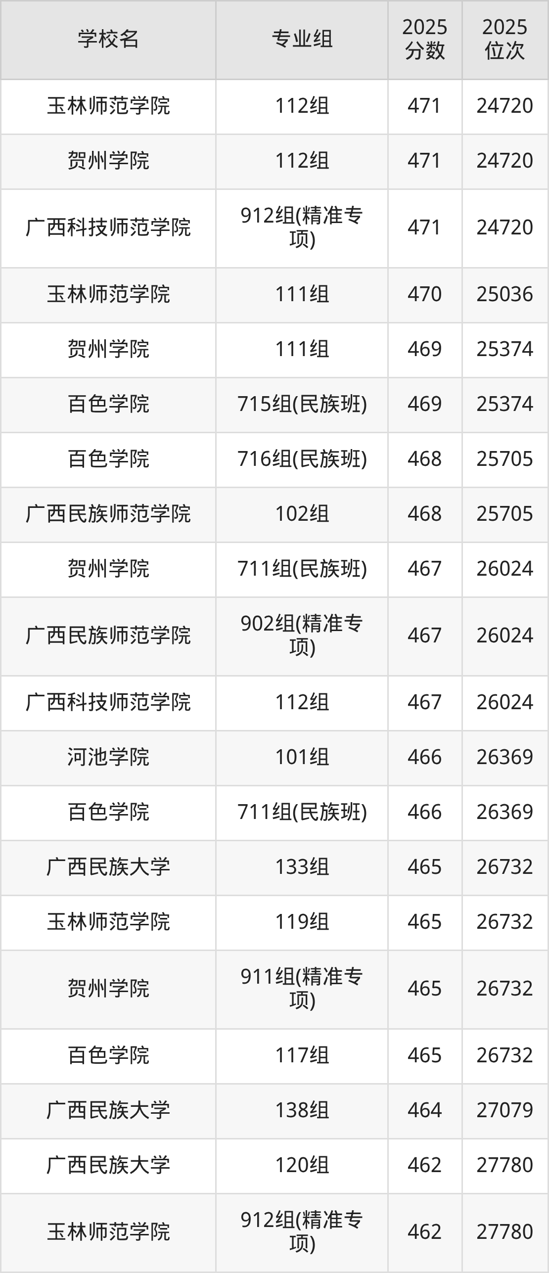 广西壮族自治区所有文科院校2025年录取分数线一览表: