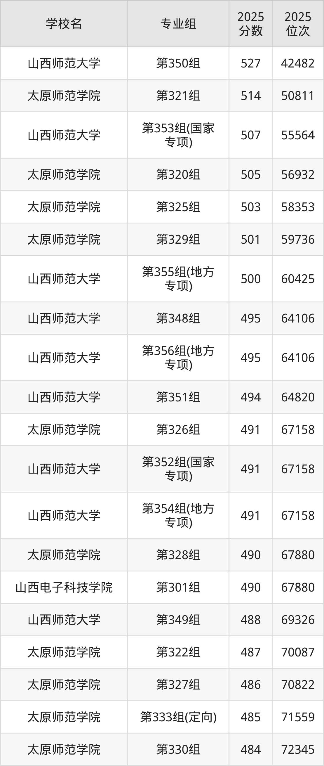 山西省所有师范类院校2025年录取分数线一览表(前34院校专业组):