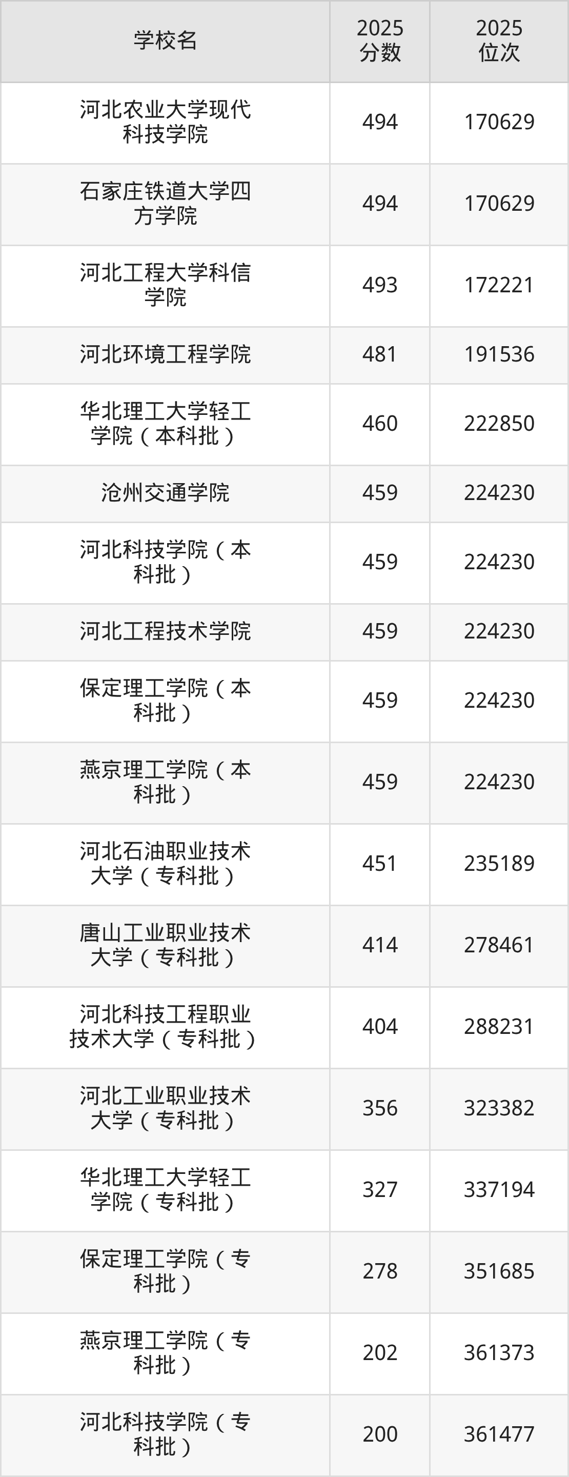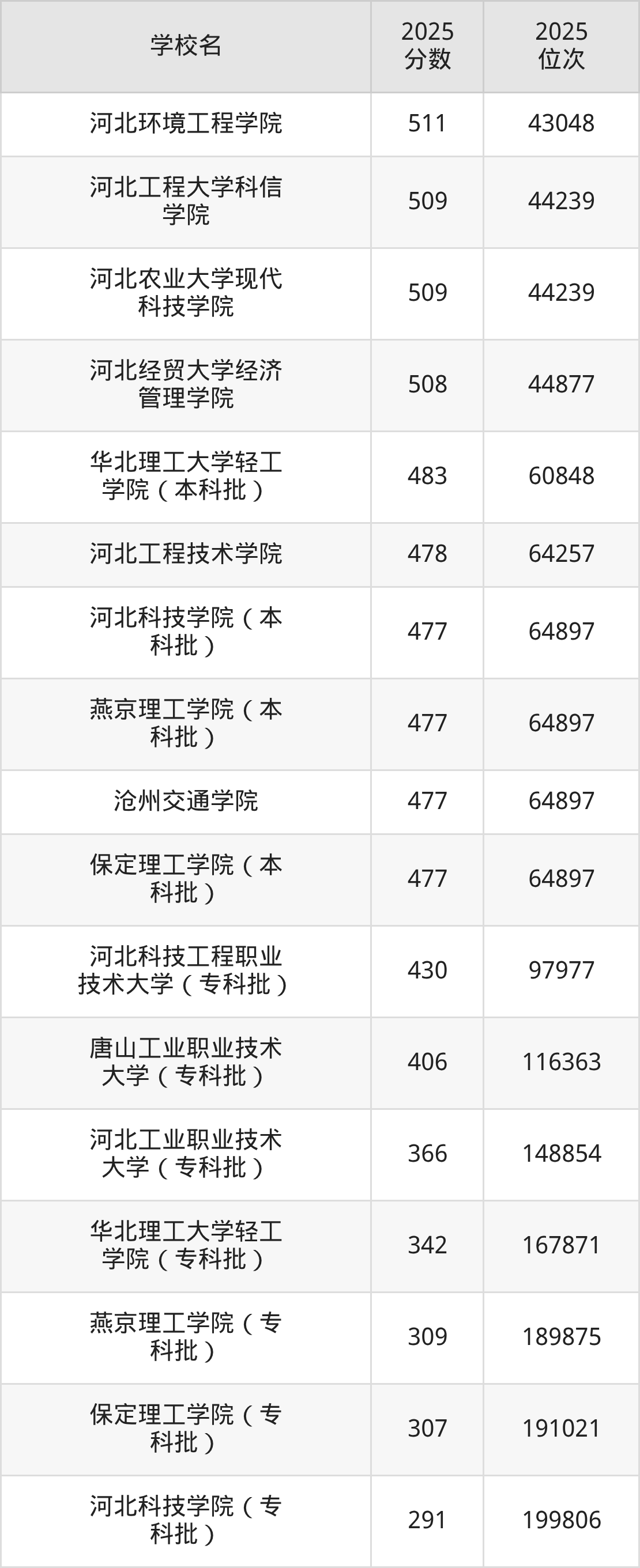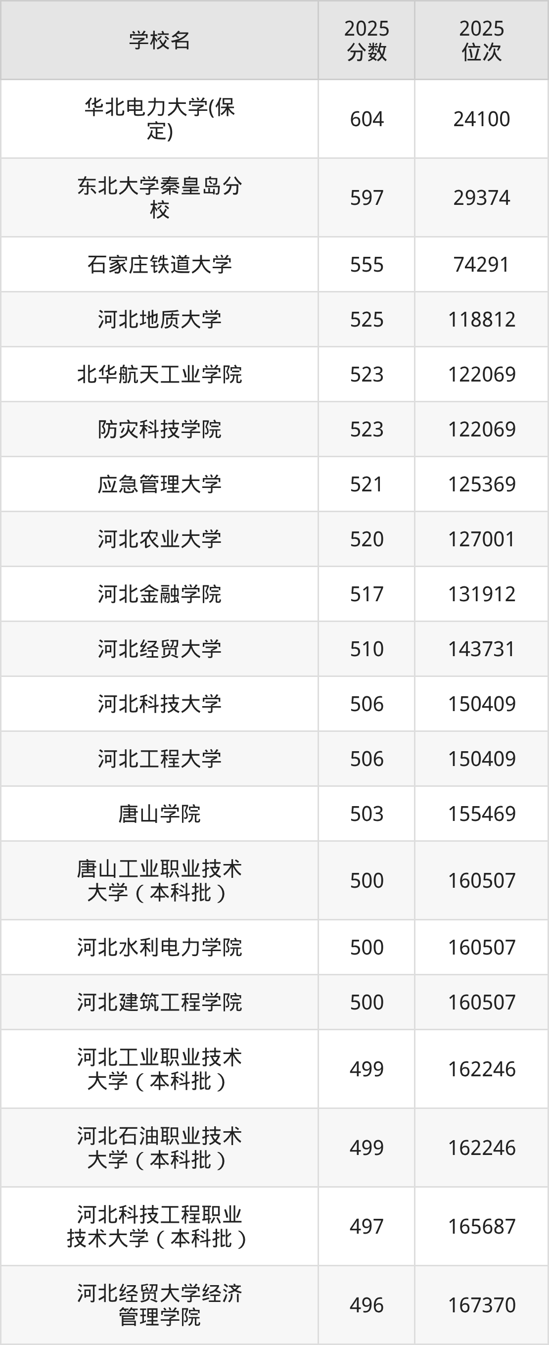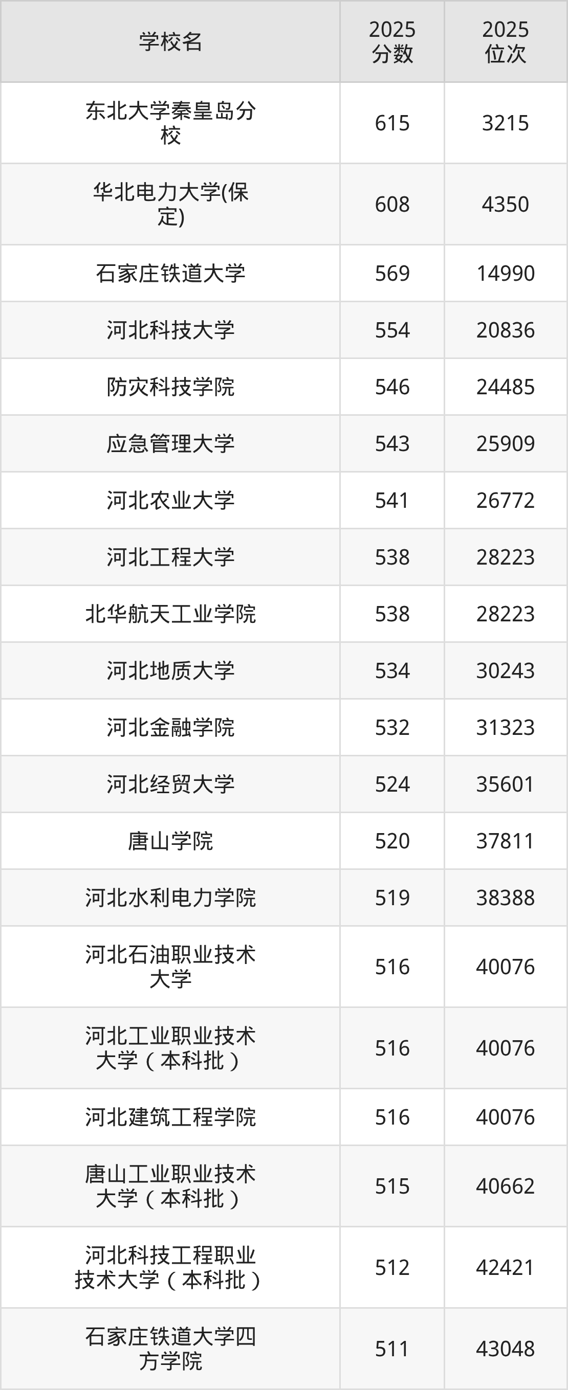 按照2025年河北省所有理科院校在省内录取分数线高低排名,为大家整理出了河北所有理科院校名单如下。