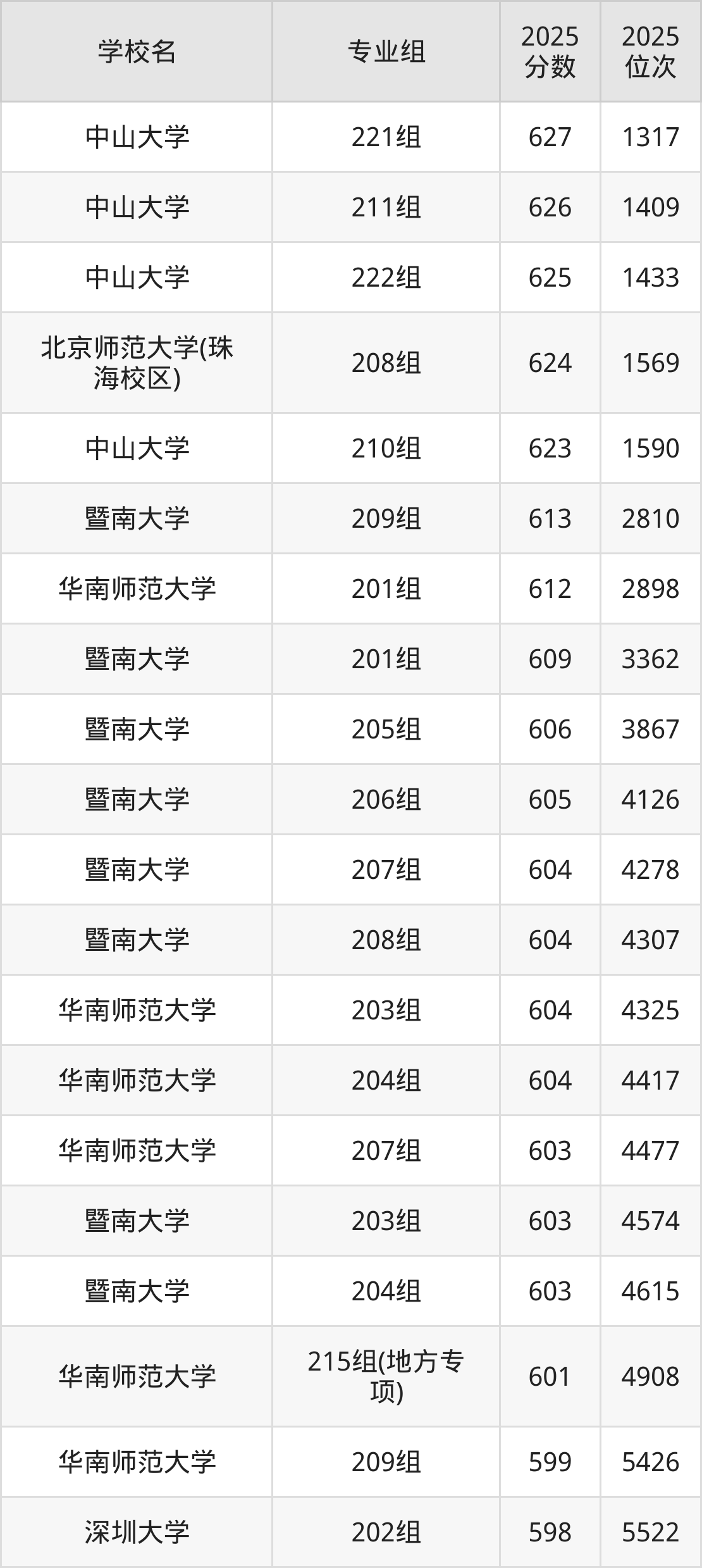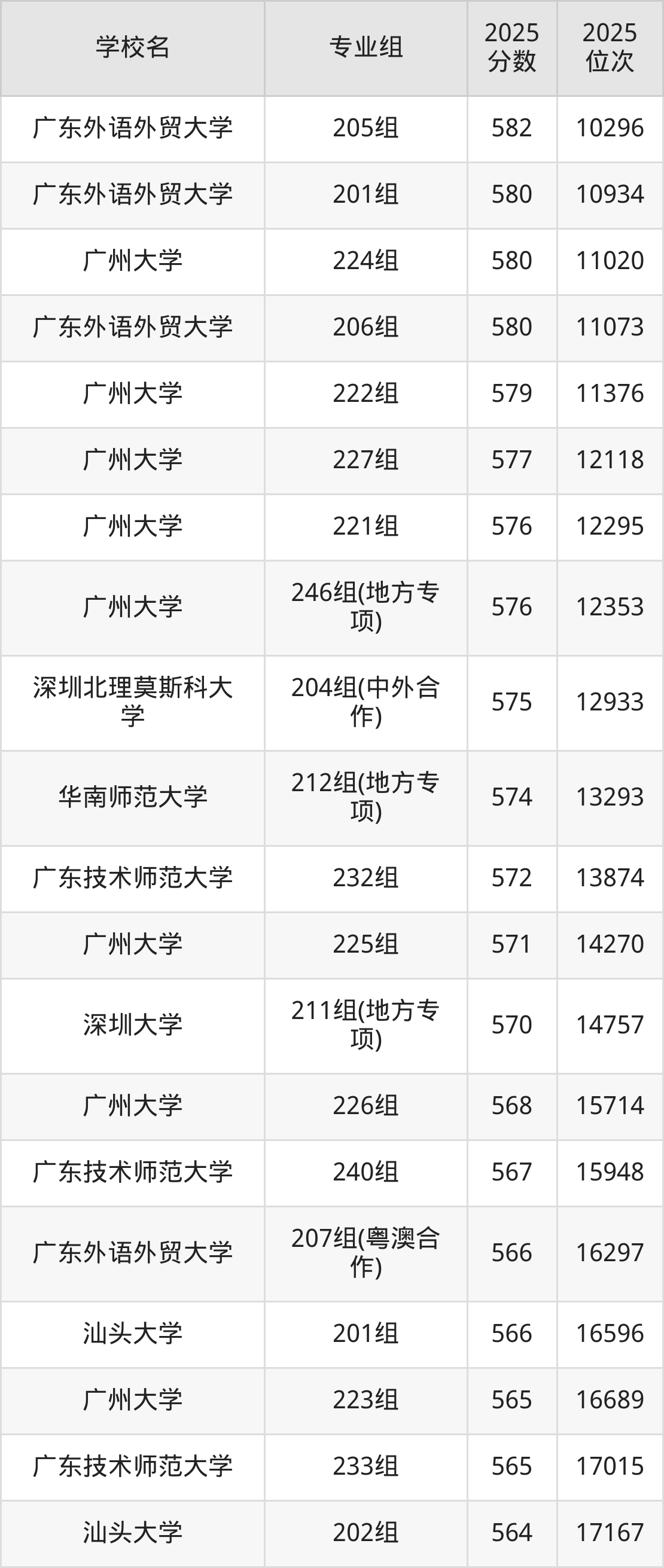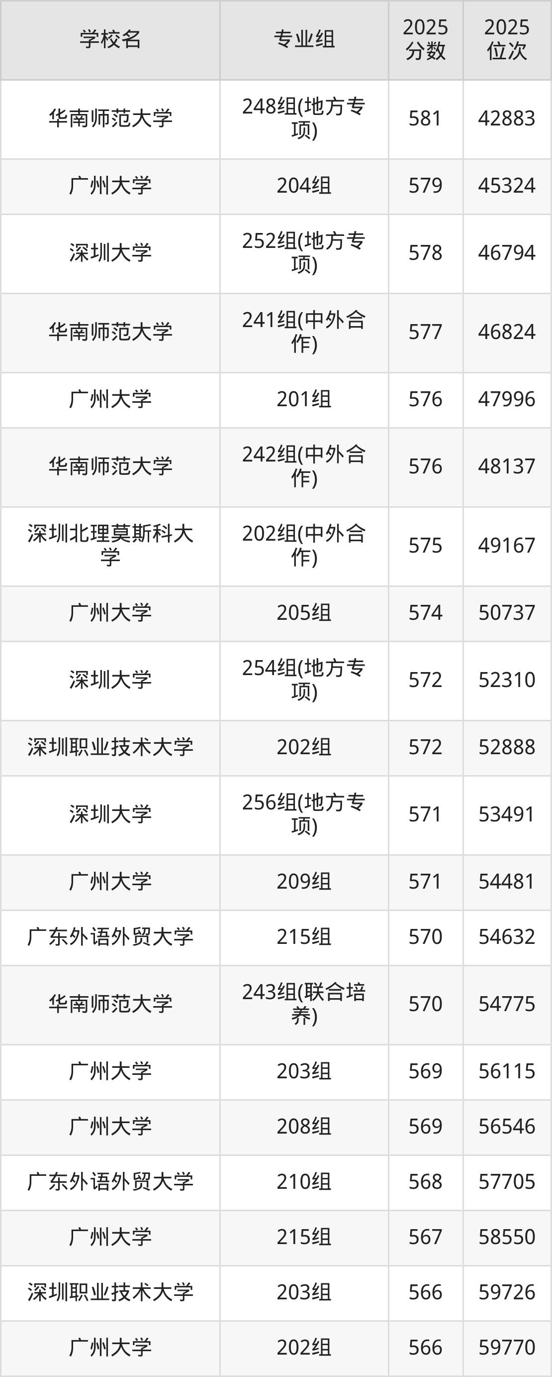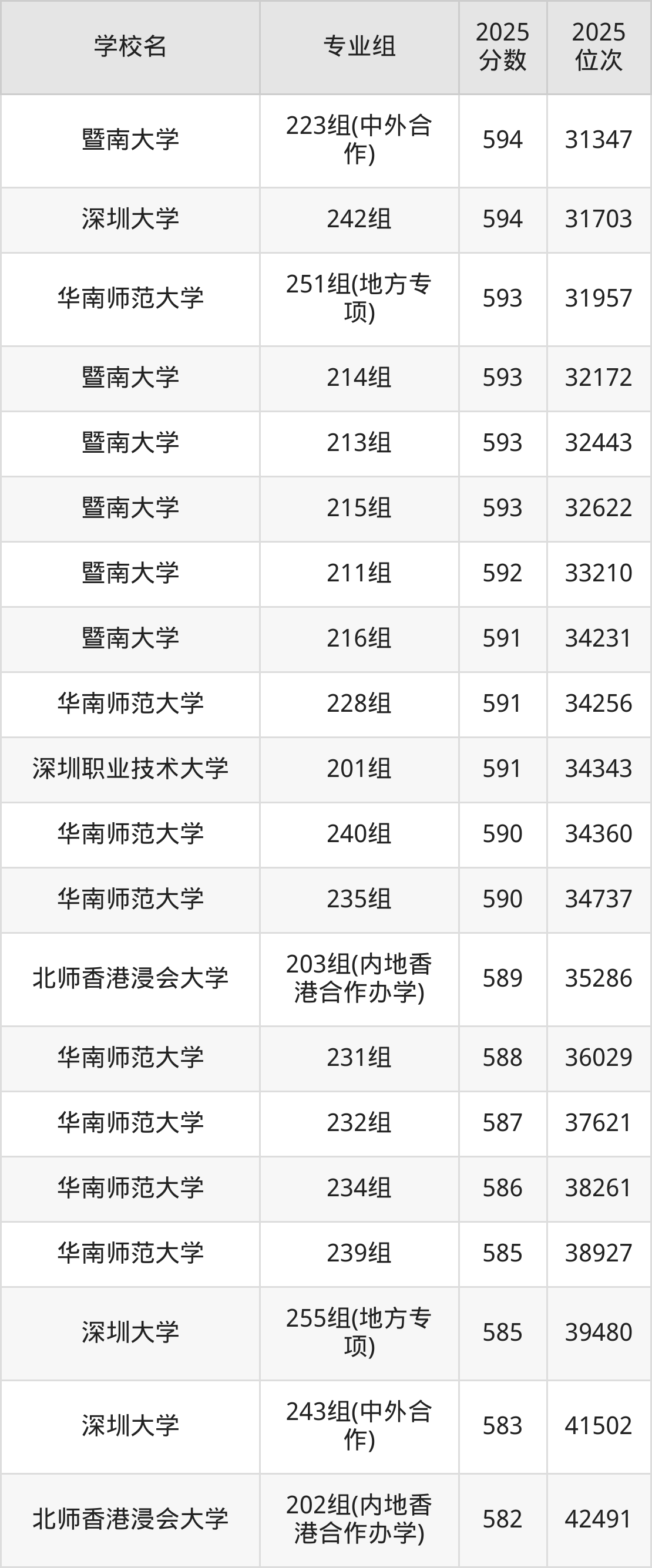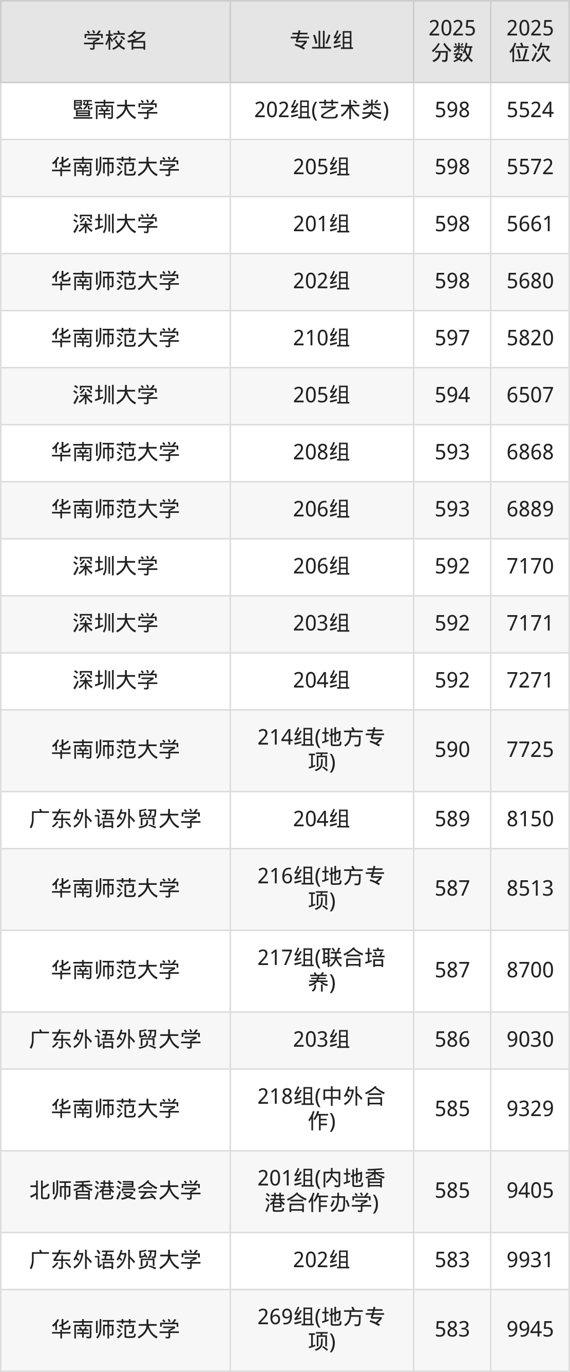 广东省所有文科院校2025年录取分数线一览表(前100院校专业组):