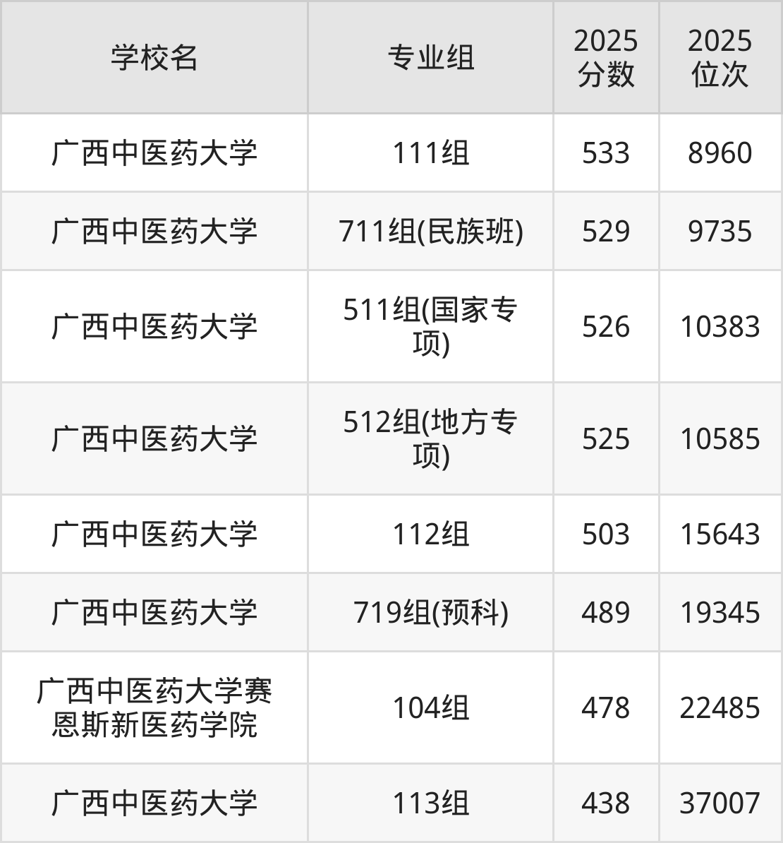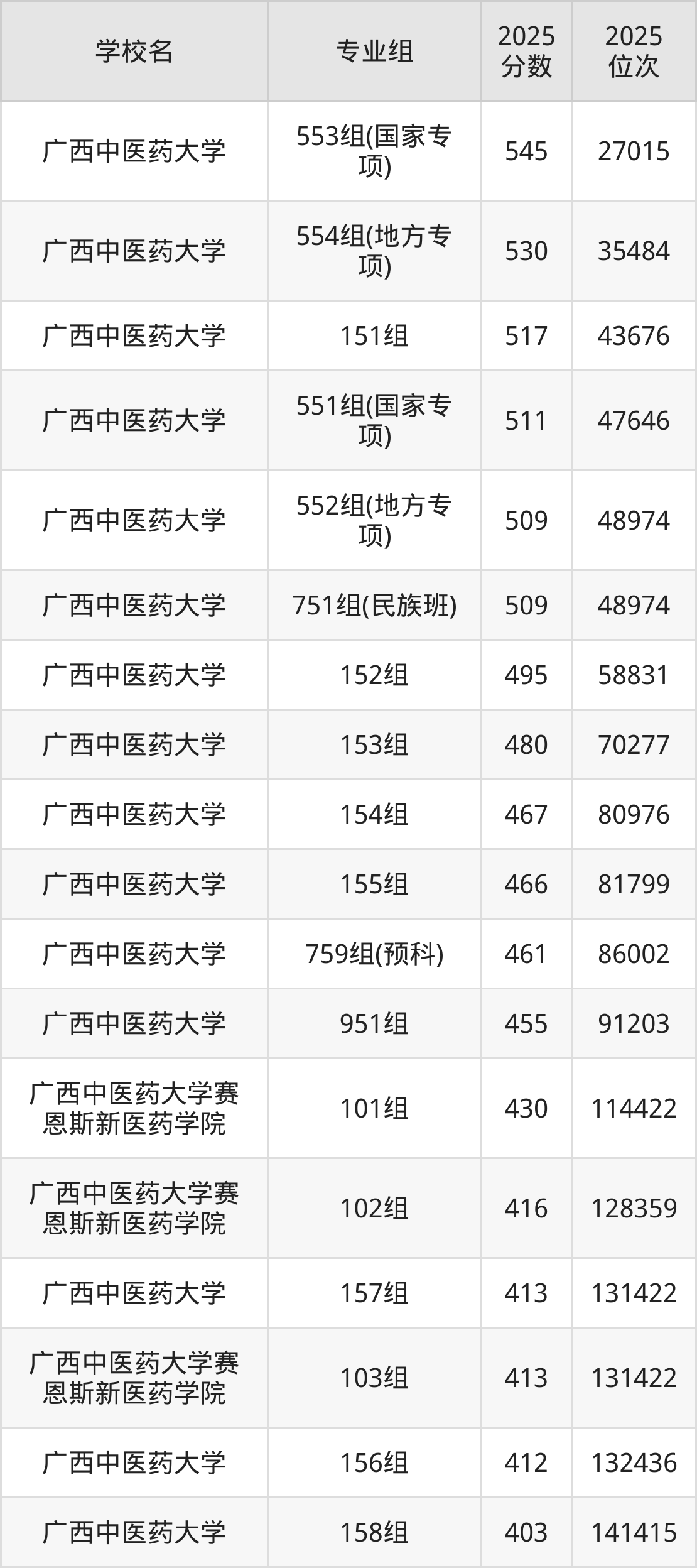 广西壮族自治区所有中医药院校2025年录取分数线一览表(前18院校专业组):