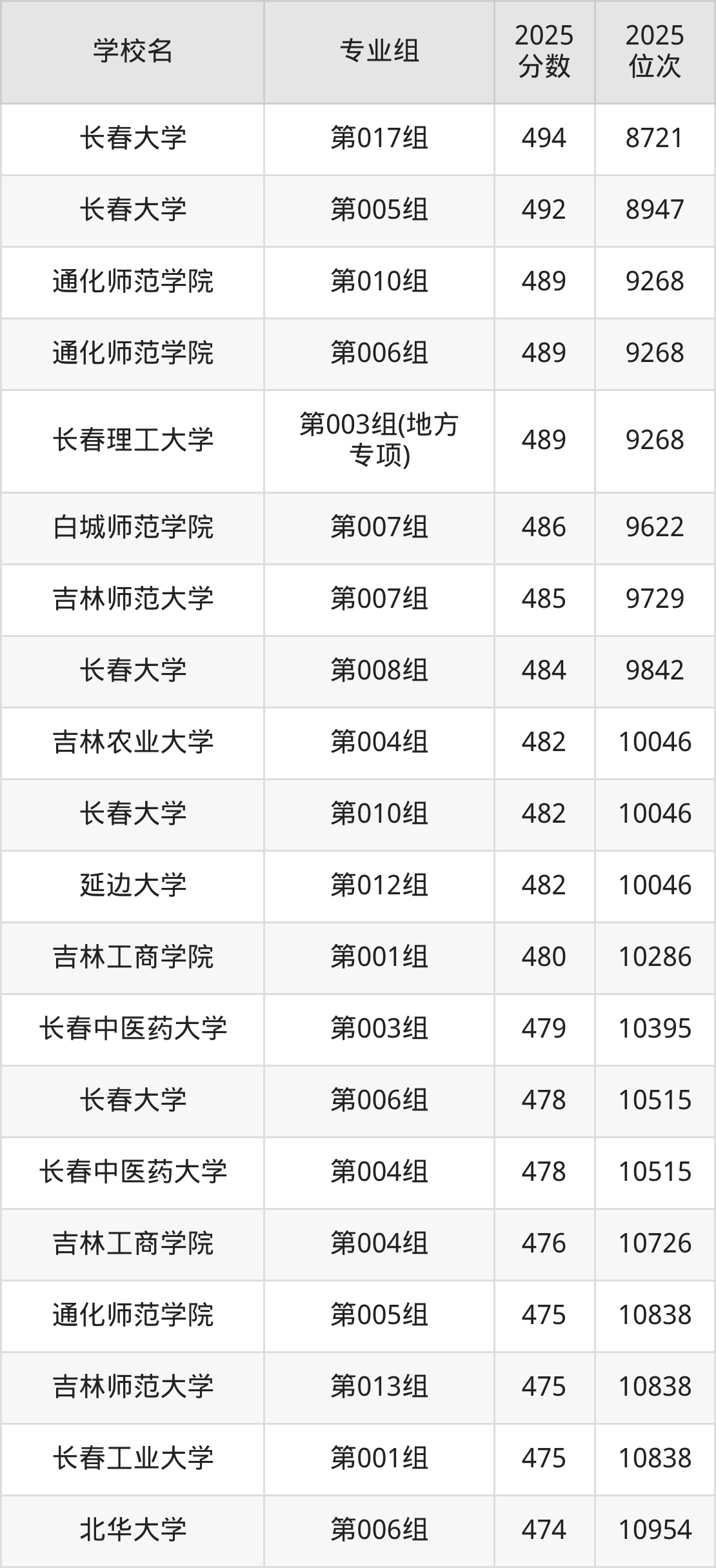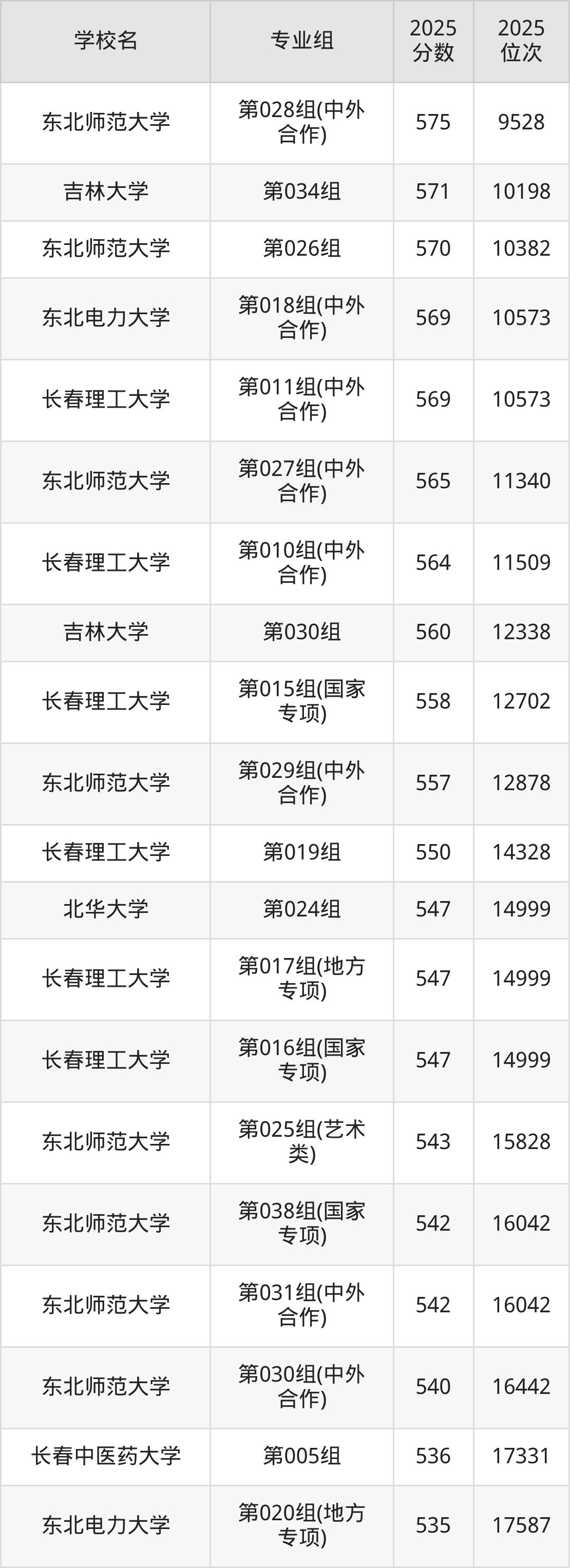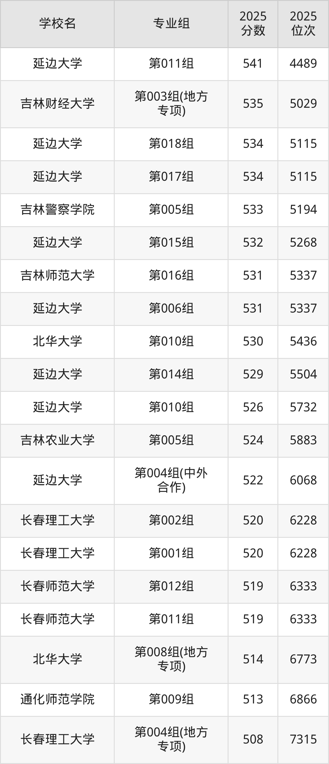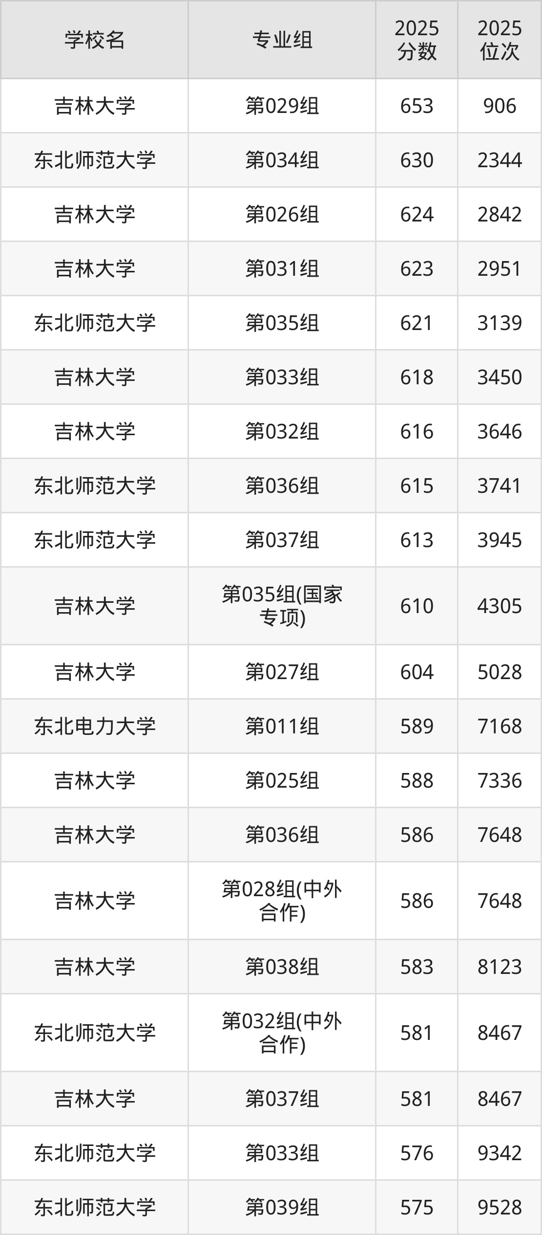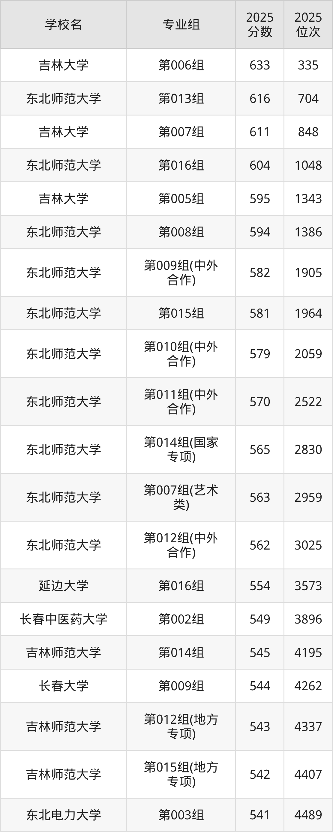 吉林省所有公办本科院校2025年录取分数线一览表(前100院校专业组):
