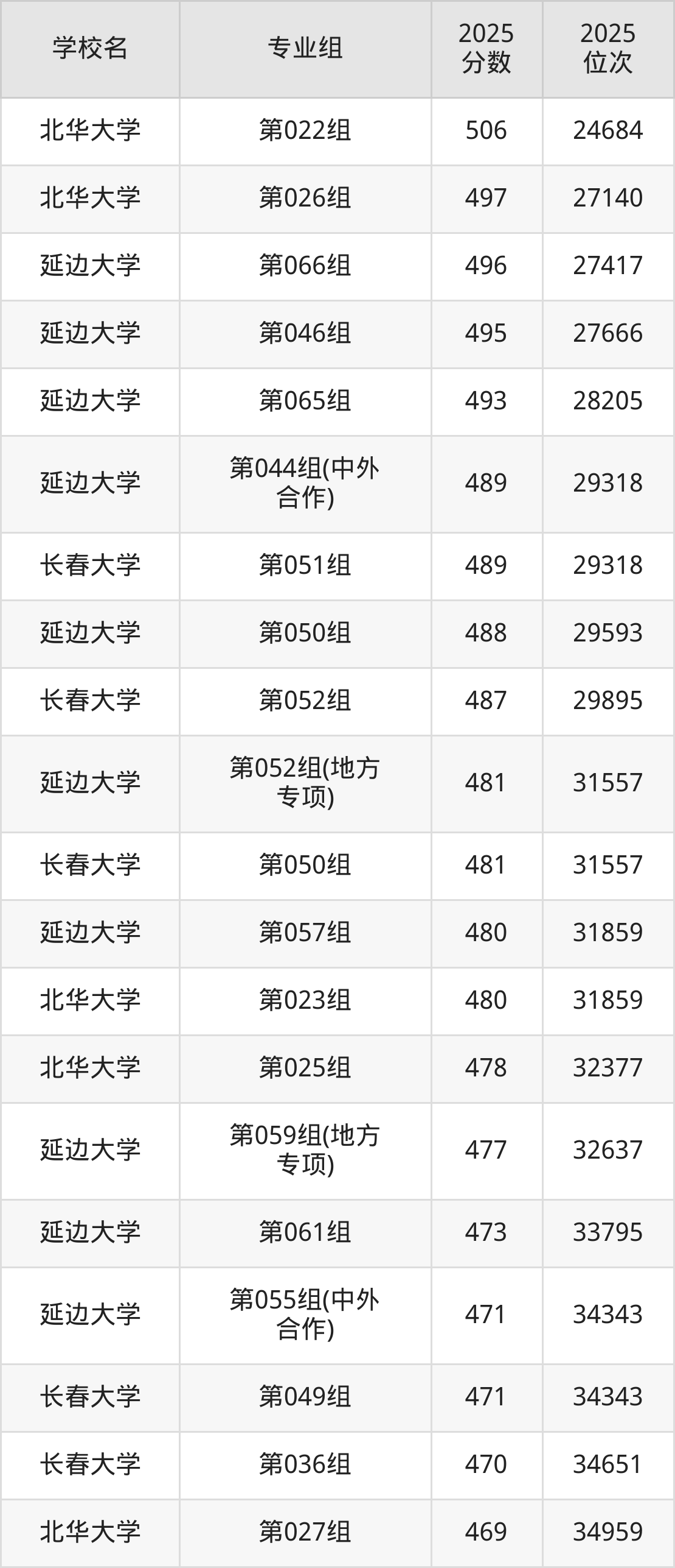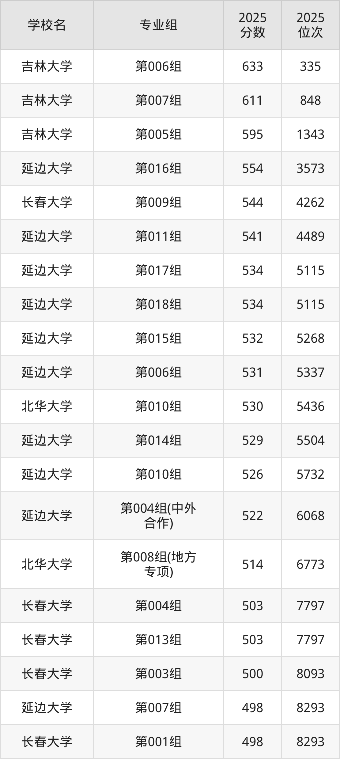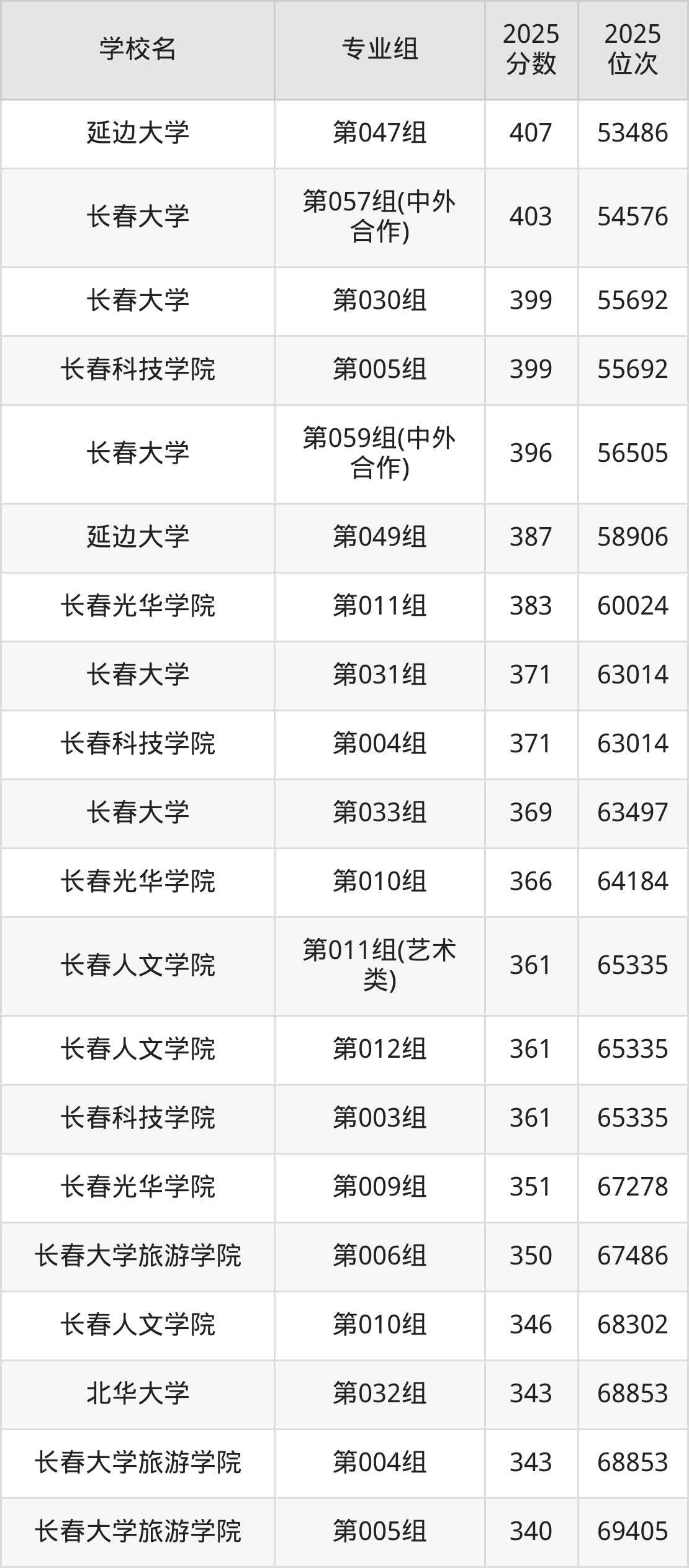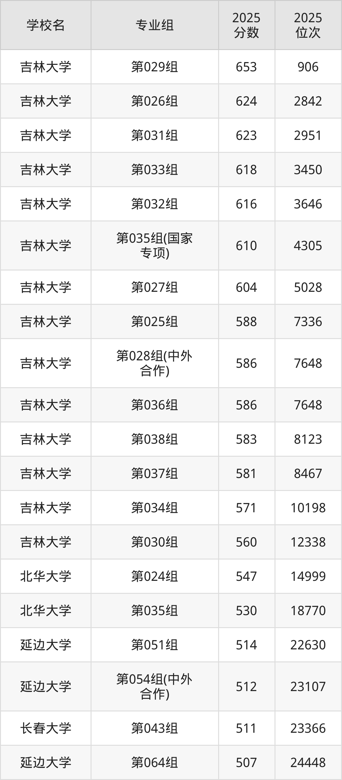 吉林省所有综合类院校2025年录取分数线一览表(前100院校专业组):