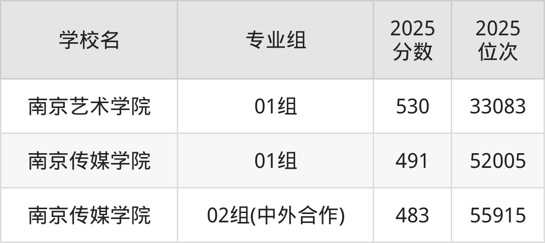 江苏省所有艺术类院校2025年录取分数线一览表(前5院校专业组):
