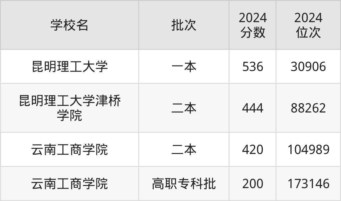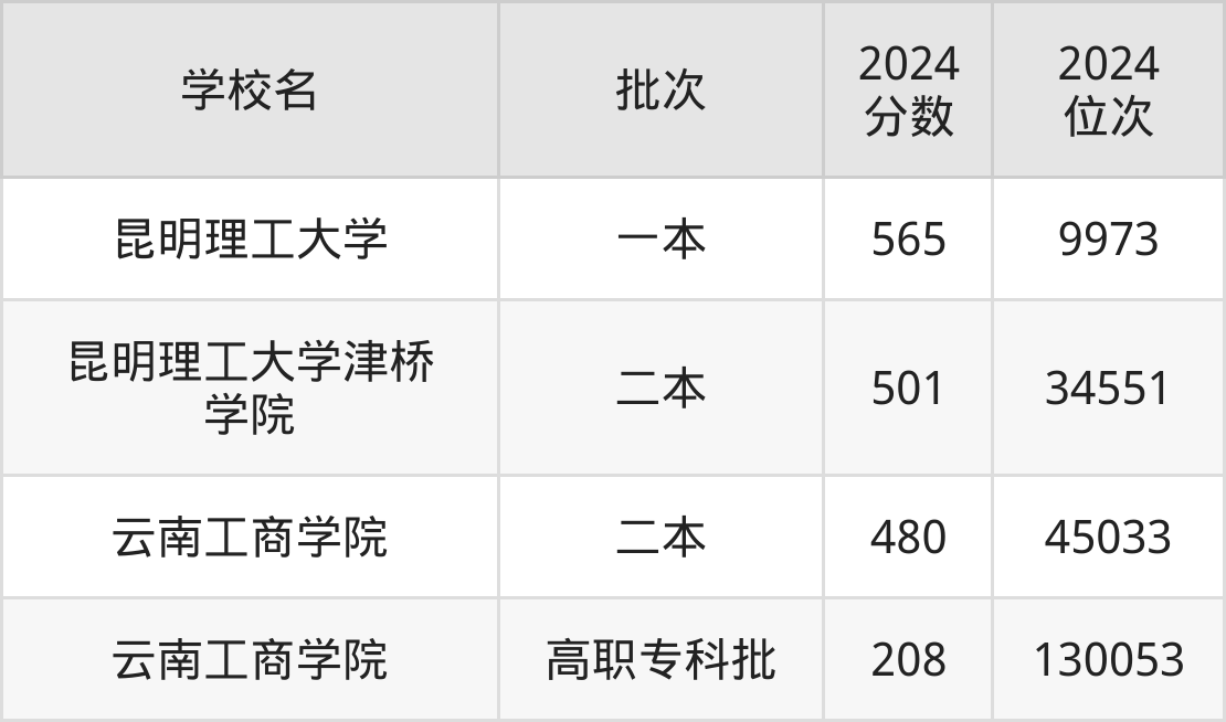 云南省所有理工类院校2024年录取分数线一览表(前4院校):