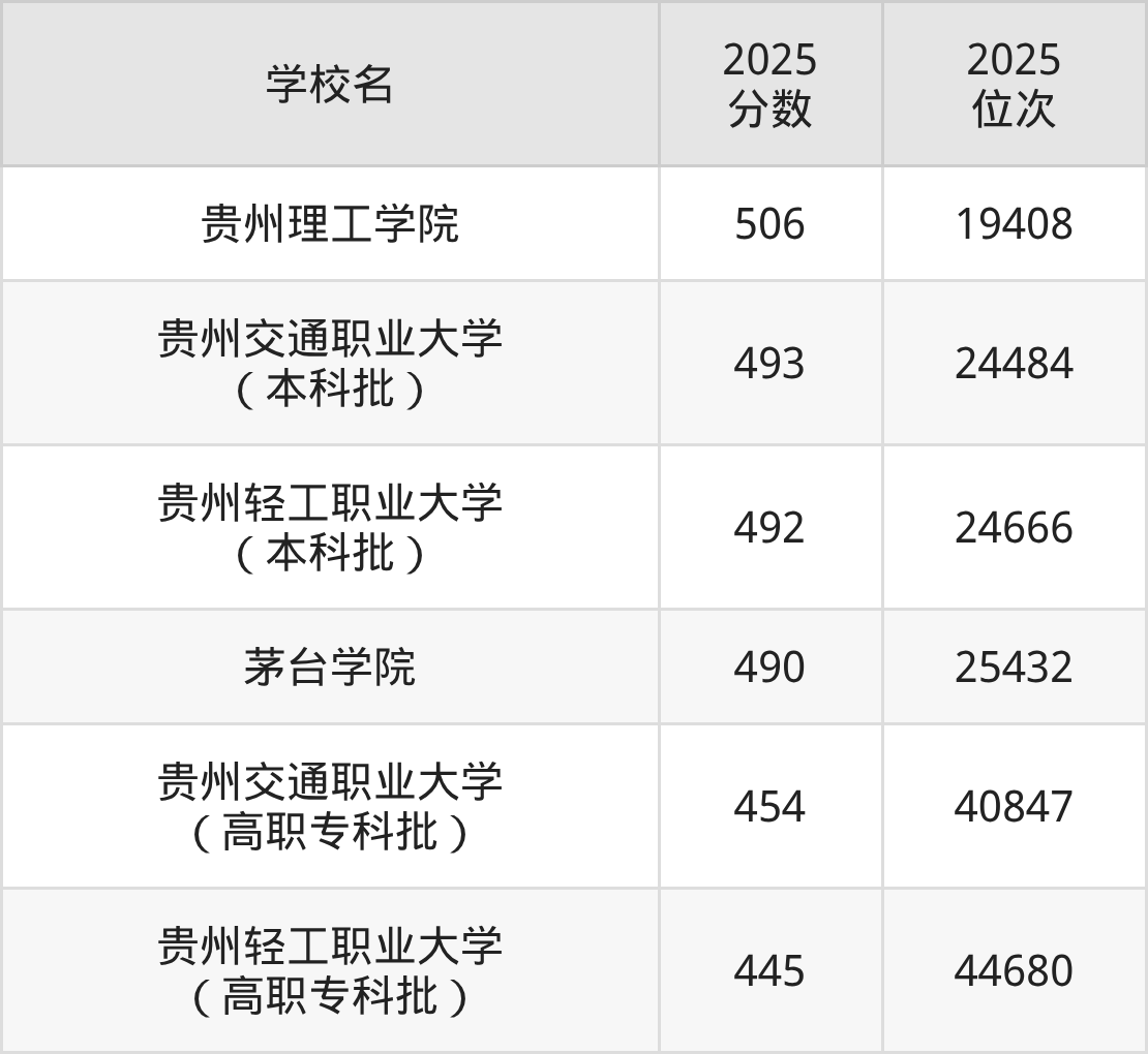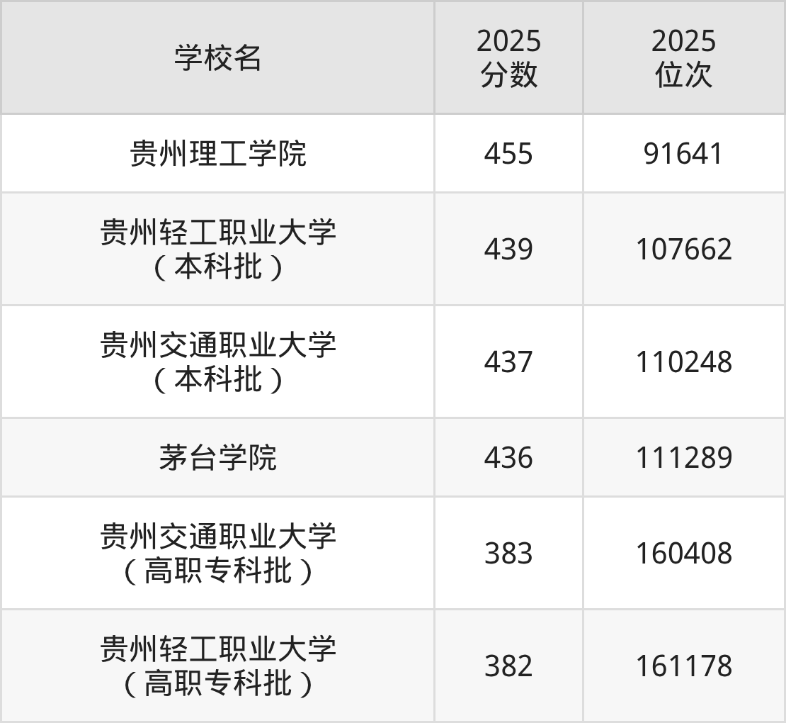 贵州省所有二本理工院校2025年录取分数线一览表: