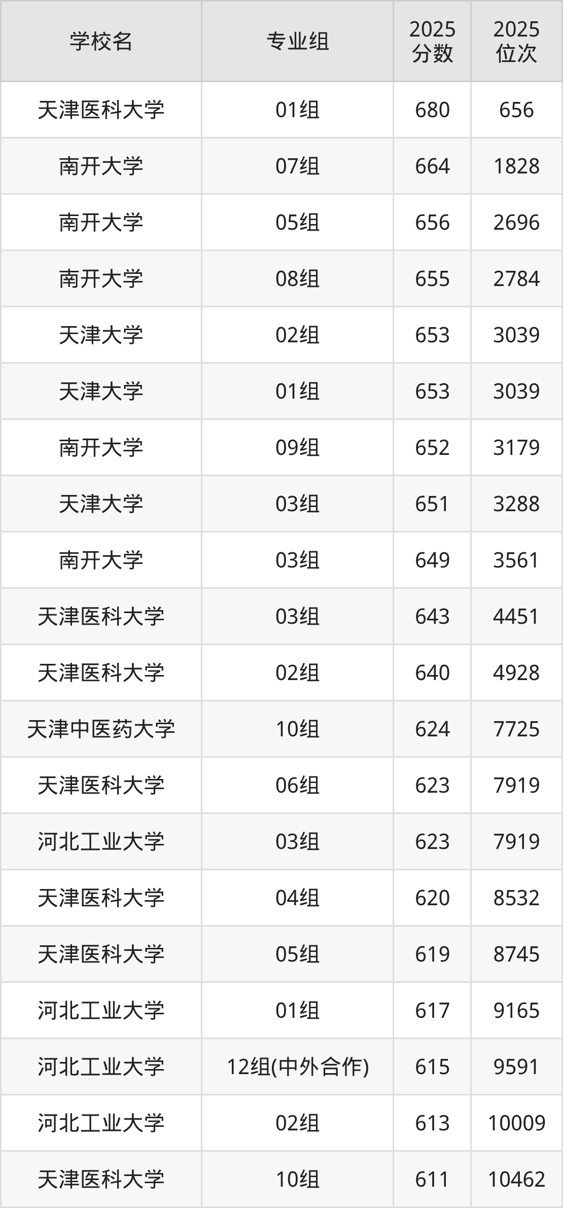 最难考、收分最高的是:天津医科大学,2025年学校的01组最低分680分,对应排位656名。